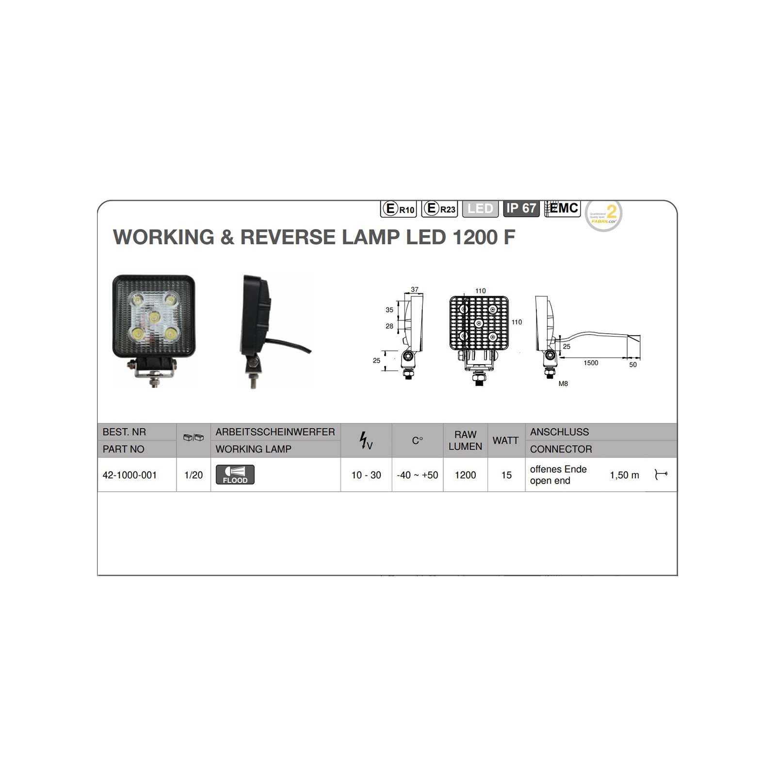 FABRILCAR Arbeits-/Rückfahrscheinwerfer 1200 F LED