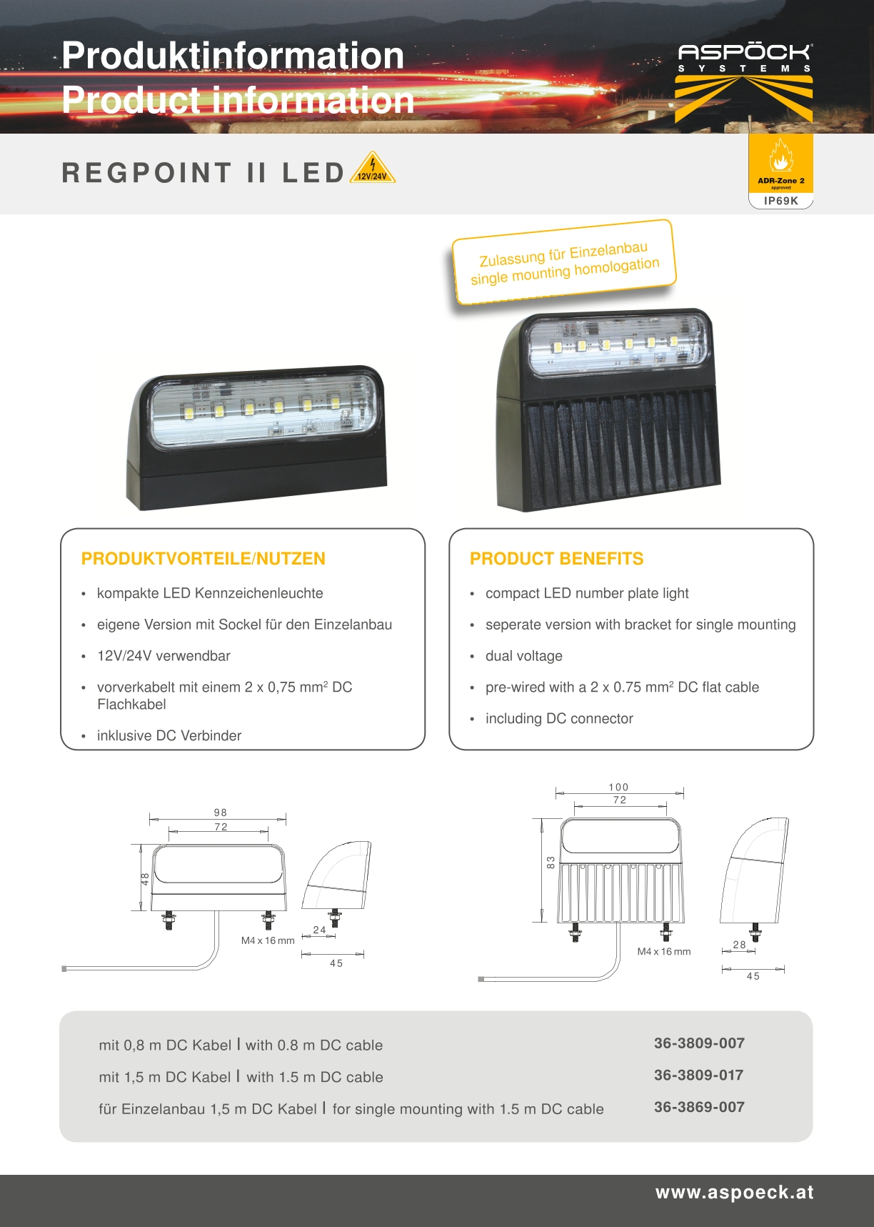 ASPÖCK Regpoint II Kennzeichenleuchte LED m. 0,8 m DC-Kabel, 12/24 V