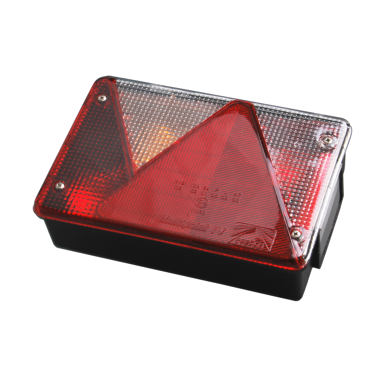 ASPÖCK Multipoint IV Rückleuchte links, mit  Blink-, Brems-, Schluss, Kennzeichen- und Nebelschlusslicht, Dreieckrückstrahler, 5-poliger Bajonettanschluss, Leuchtmittel H: 136 x B: 200 x T: 56 mm