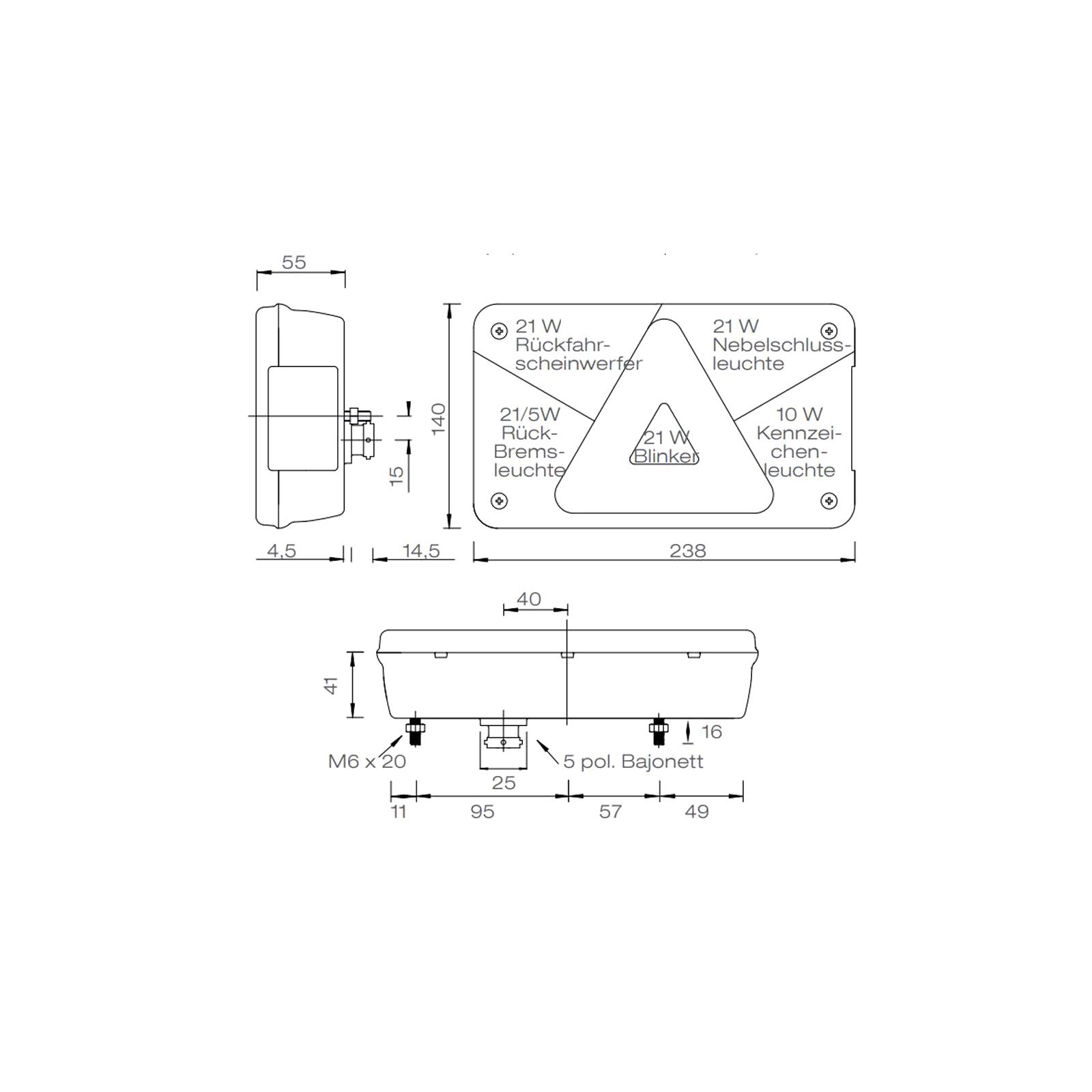 ASPÖCK Multipoint V Rückleuchte rechts, mit  Blink-, Brems-, Schluss-, Kennzeichen- und  Rückfahrlicht, Dreieckrückstrahler, 5-poliger Bajonettanschluss, Leuchtmittel H: 140 x B: 238 x T: 55 mm