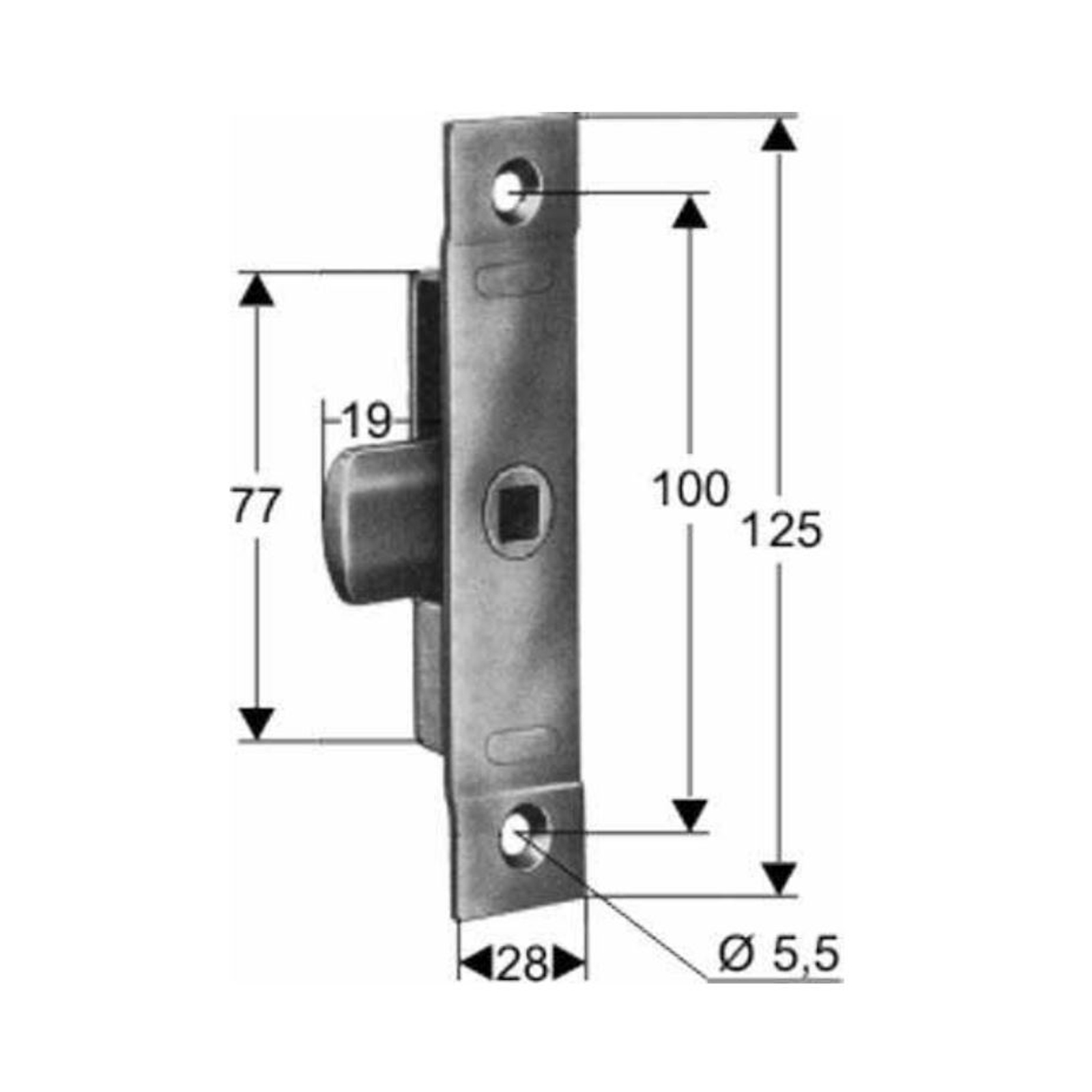 Zungenschloss, 28 x 125 mm, Lochabstand 100 mm, Bohrungen ⌀ 5,5 mm, Vkt. 8 mm, Stahl verzinkt
