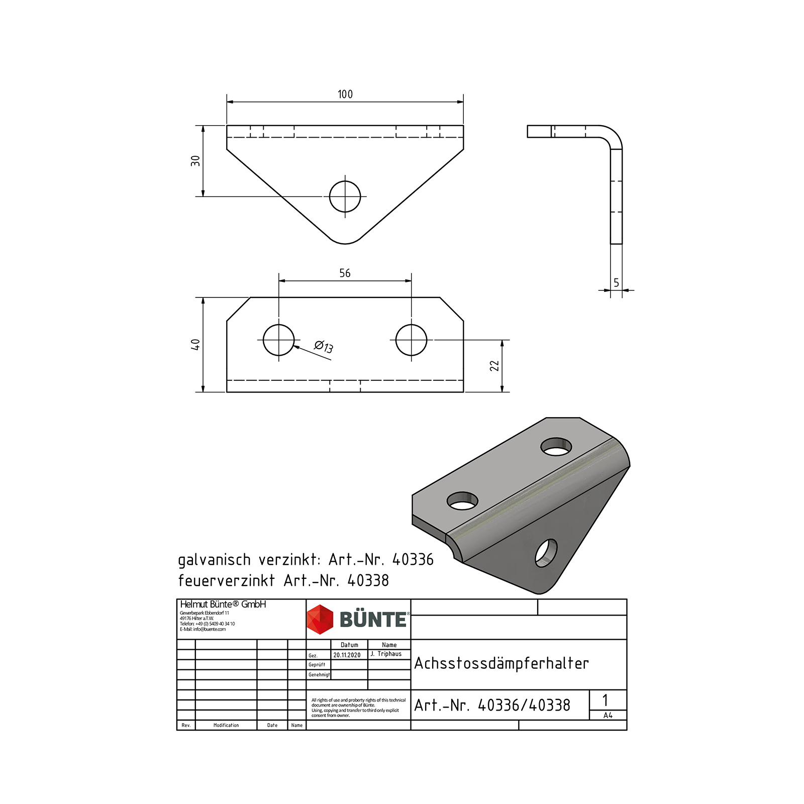 Achsstoßdämpferhalter, 90° abgewinkelt, 40 x 100 mm, Lochabstand 56 mm, Bohrungen ⌀ 13 mm, Stahl verzinkt