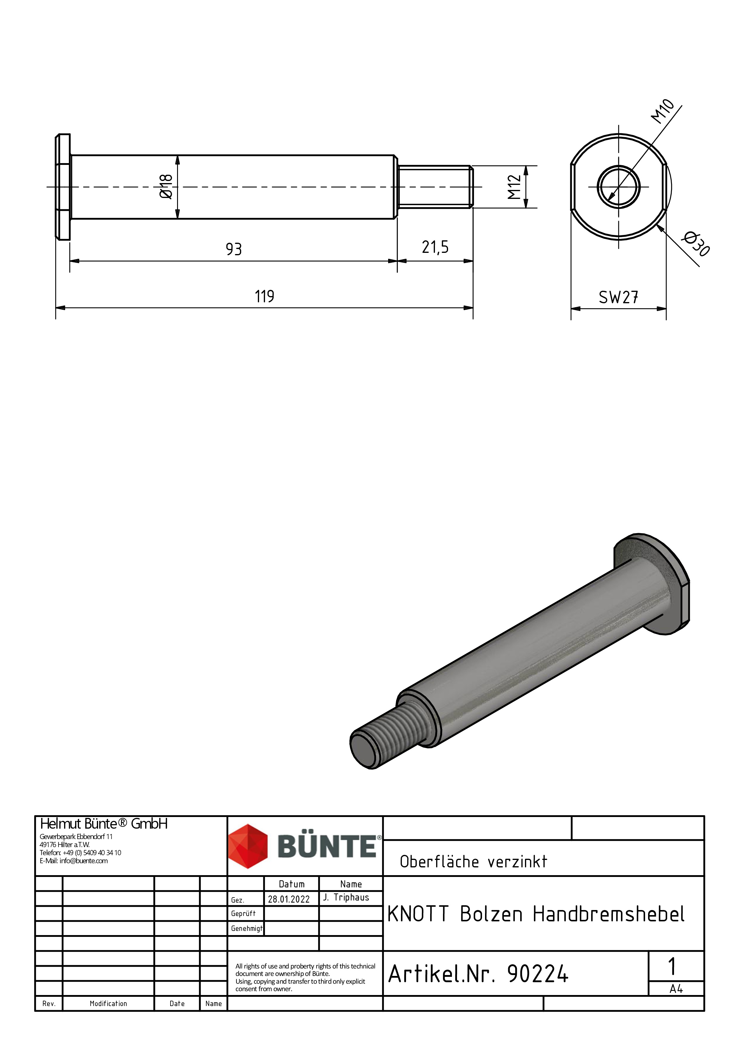 KNOTT Bolzen mit Gewindezapfen für KF 7,5 - 20, für Handbremshebel Ausf. KH/ HF