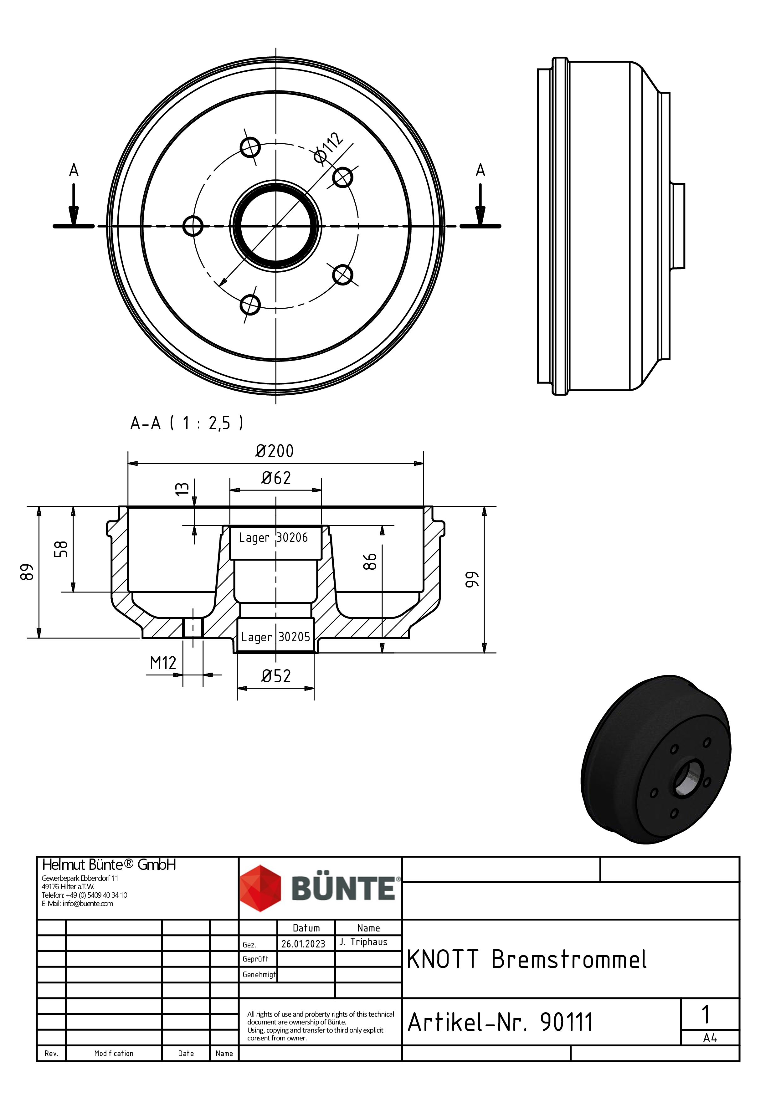 KNOTT Bremstrommel, ⌀ 200 x 30/50 mm, für Radbremse 20-965/963/1, 20-966/964/1, Lochkreis  112/5, für Kegelrollenlager 30205/30206