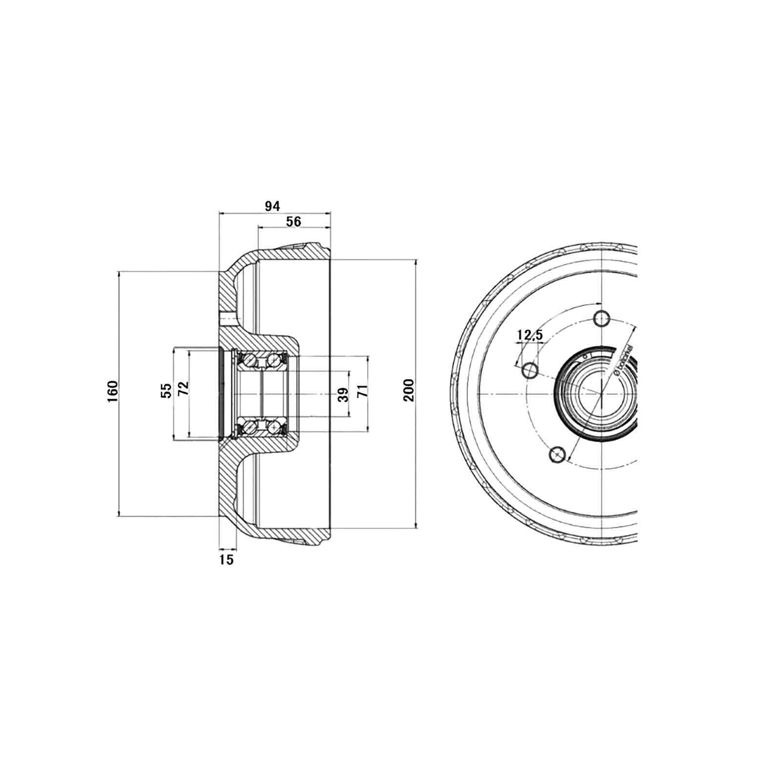 Bremstrommel, ⌀ 200 x 50 mm, für Radbremse AL-KO 2051, verstärkt 1500 kg, Lochkreis 112/5, mit  Kompaktlager ⌀ 39/72 x 37 mm