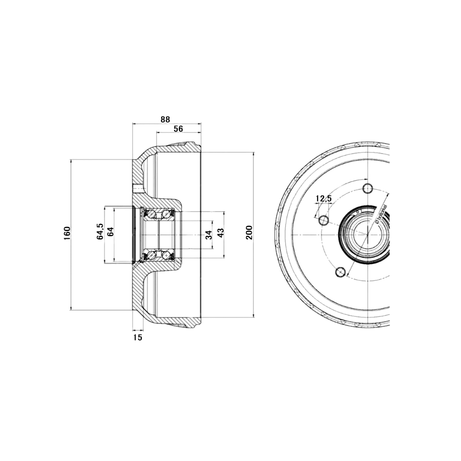 Bremstrommel, ⌀ 200 x 50 mm, für Radbremse BPW S 2005-7 RASK, Lochkreis 112/5, mit Kompaktlager ⌀ 34/64 x 37 mm, Lagersitztiefe 13 mm, 1350 kg