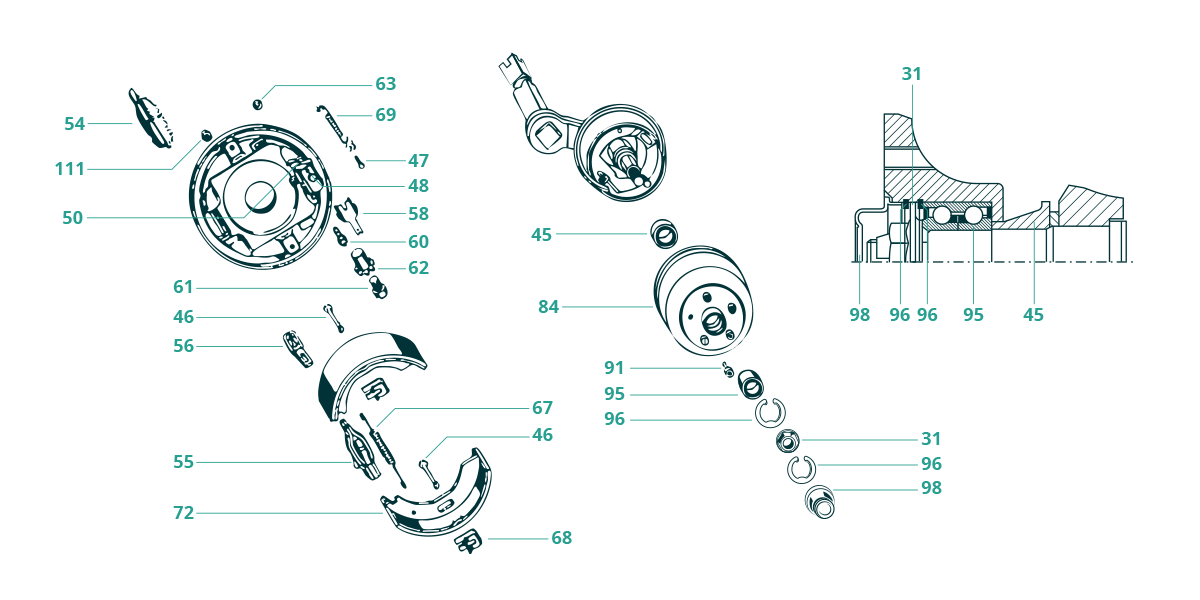 Bremsbacken Teilekit S 2005-7 (inkl. Pos. 46, 67, 68, 69, 72) Spannstift Bolzen (entfällt ab Bj. 06/98) Bolzen BPW Brems-Formteil rechts BPW Brems-Formteil links BPW Bremsseilführung, Schlauchführung BPW Spreizschloss für S 2005-7 Bremsen Zugbügel für Bremsbowdenzug Sicherungsklammer BPW Nachstellbolzen Schraube Nachstellmutter Sicherung Zugfeder bis 06/98 nicht mehr lieferbar Zugfeder ab 06/98 Spannfeder Zugfeder bis 06/98 Zugfeder ab 06/98 Stopfen