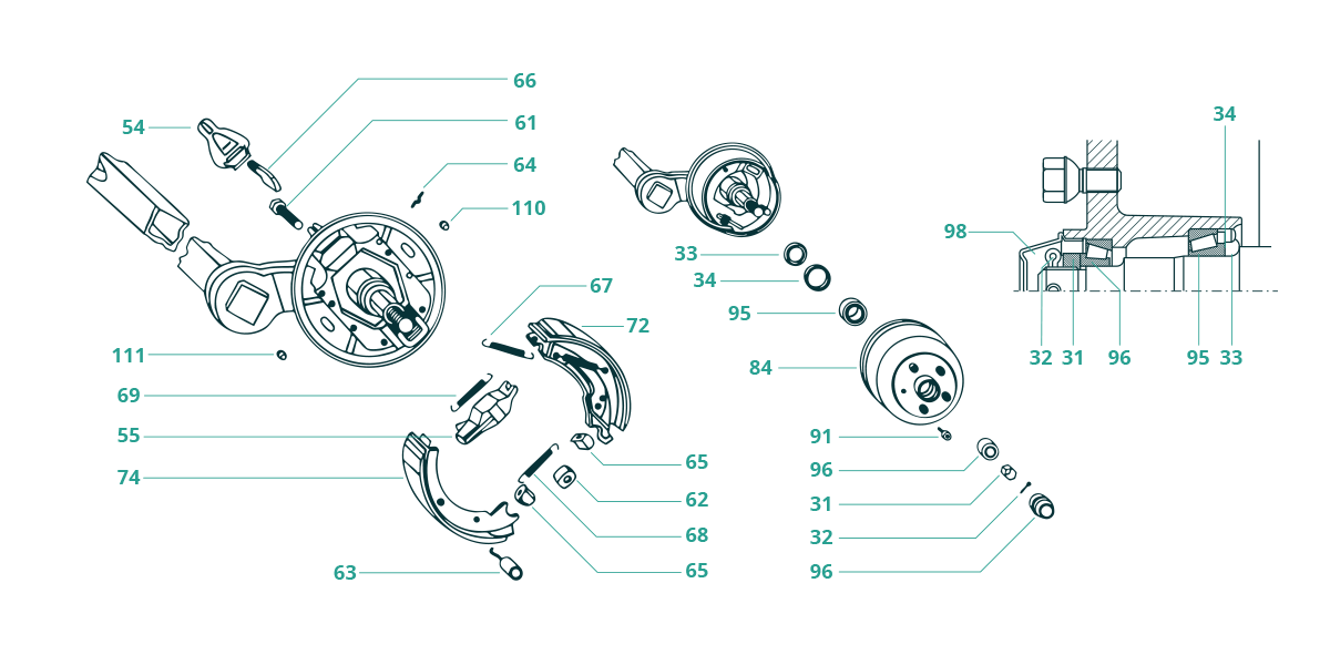 Kronenmutter Splint Dichtring oder Fey-Dichtung Nylosring Bremstrommel 5 x 112, M12 x 1,5, Y=100, CB/DB 330/331 Kegelrollenlager Kegelrollenlager Fettkappe, 53 mm Reparatursatz (inkl. 31-36, 95-98)