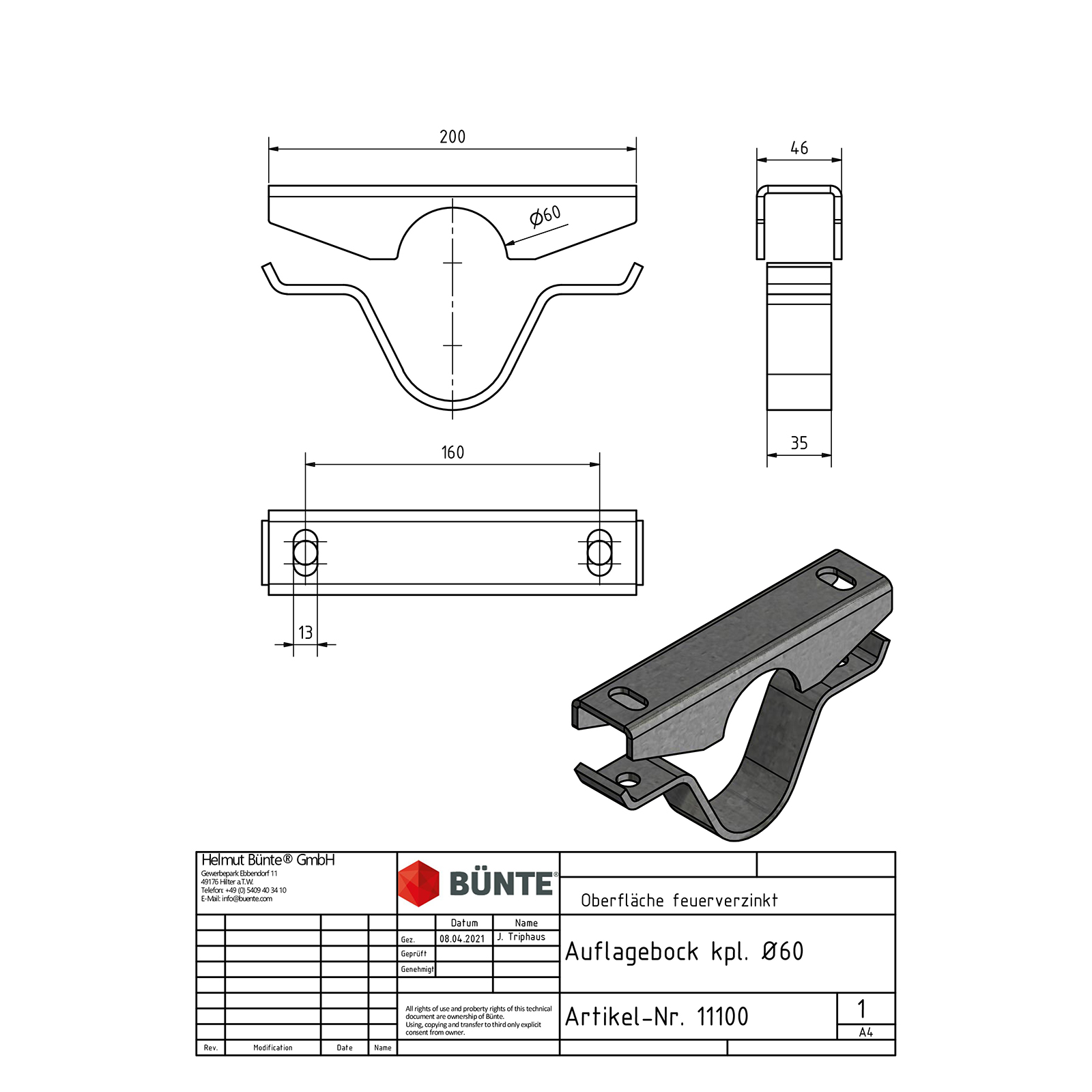 SCHLEGL Auflagebock, für Deichselrohr ⌀ 60 mm, Lochabstand 160 mm, Höhe 11 mm
