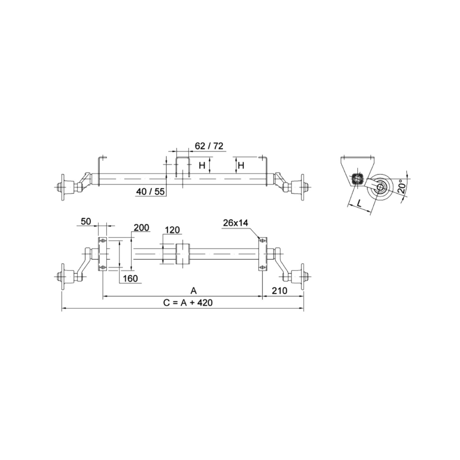 SCHLEGL Laufachse MB8, Ausf. A, 750 kg, Hochbock, AM: 1400 mm, FM: 1820 mm, Vkt. 60 mm, Ans.: 112/5