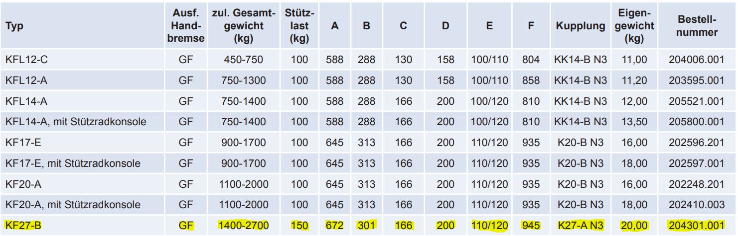 KNOTT Auflaufeinrichtung KF27-B, 1400-2700 kg,  Lochabstand vorne/hinten/seitlich 110-120/200/ 166 mm, Stützlast 150 kg, mit Zugkugelkupplung  K27-A