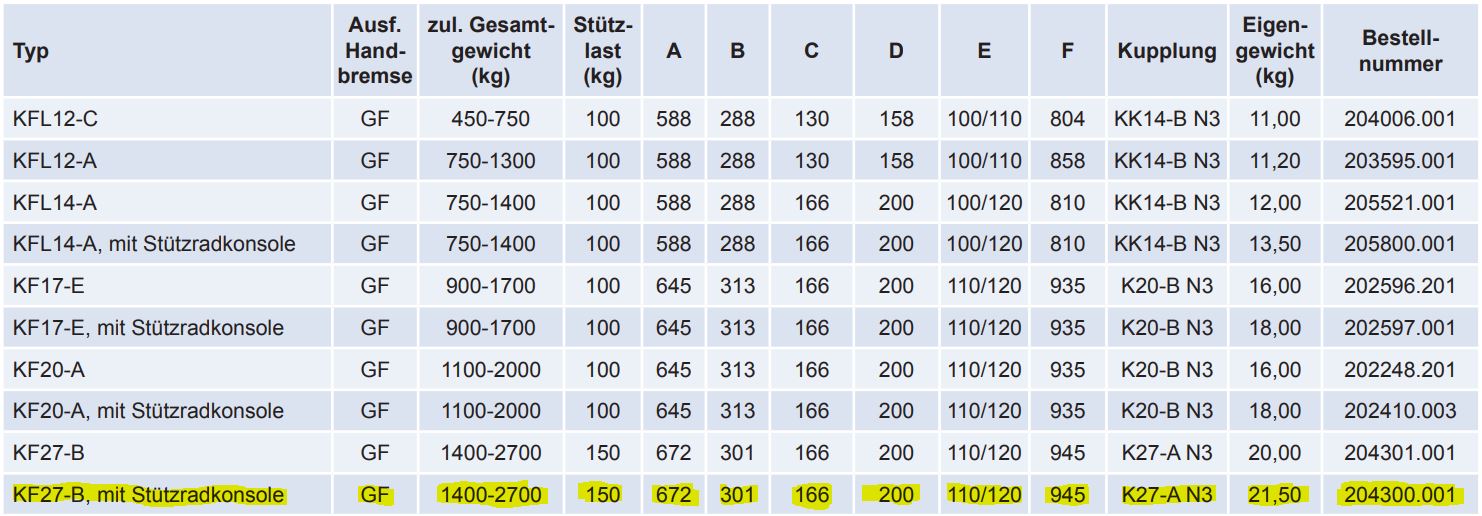 KNOTT Auflaufeinrichtung KF27-B, 1400-2700 kg,  Lochabstand vorne/hinten/seitlich 110-120/200/ 166 mm, Stützlast 150 kg, mit Zugkugelkupplung  K27-A, Stützradkonsole