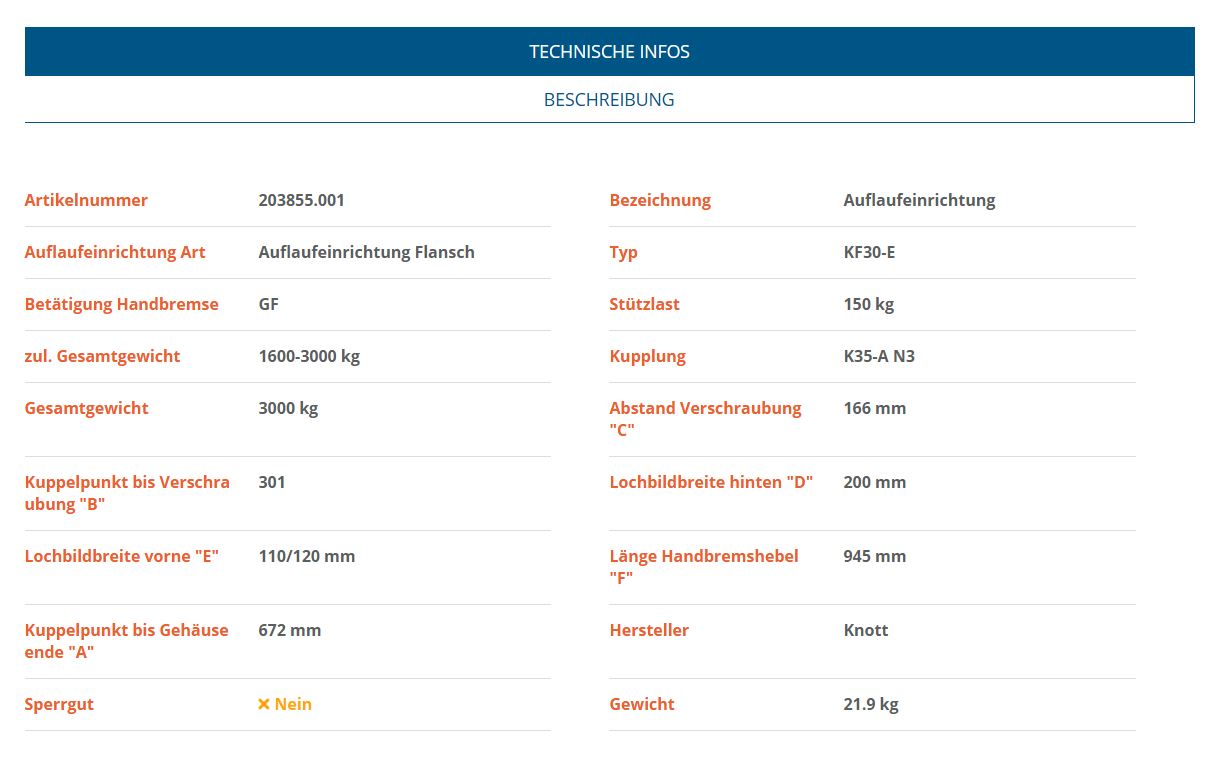 KNOTT Auflaufeinrichtung KF30-E, 1600-3000 kg,  Lochabstand vorne/hinten/seitlich 110-120/200/ 166 mm, Stützlast 150 kg, mit Zugkugelkupplung  K35-A