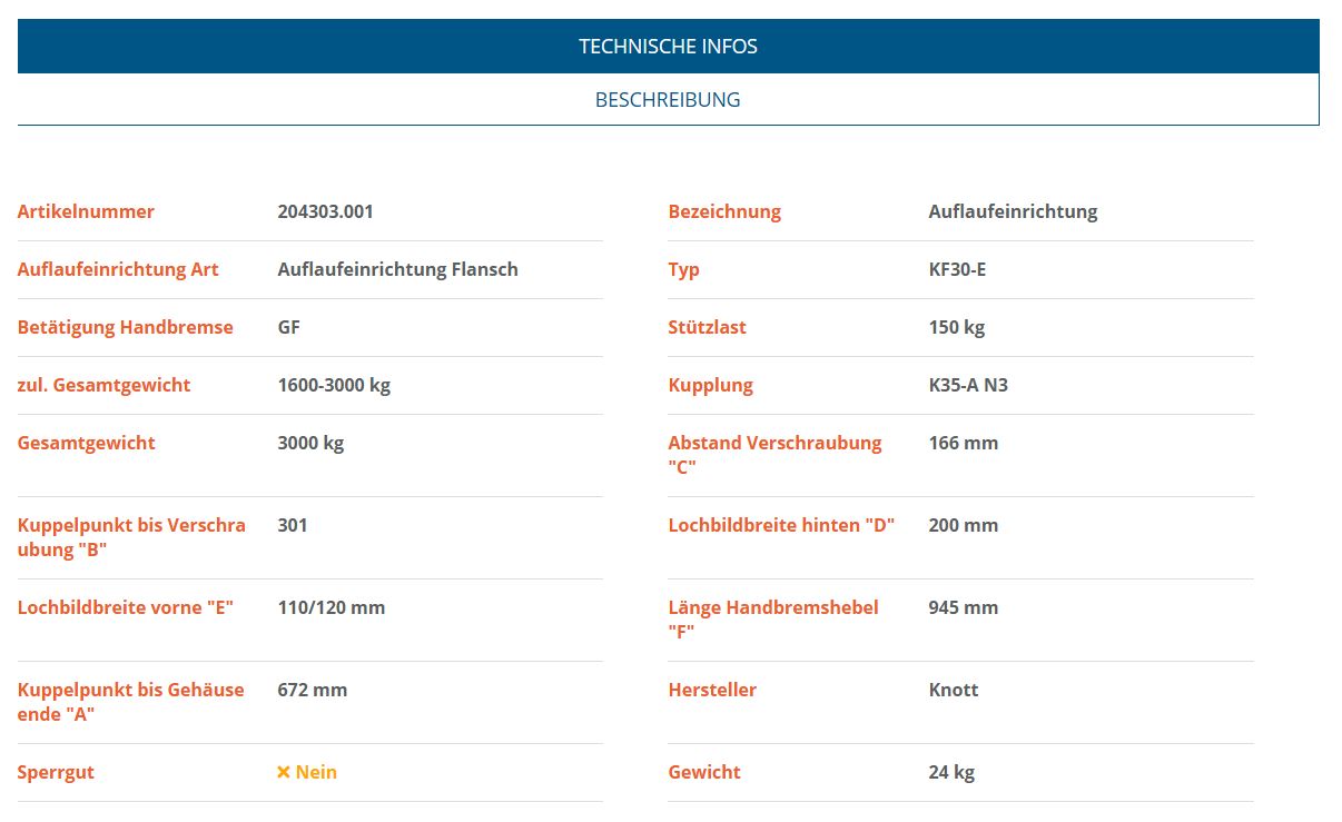KNOTT Auflaufeinrichtung KF30-E, 1600-3000 kg,  Lochabstand vorne/hinten/seitlich 110-120/200/ 166 mm, Stützlast 150 kg, mit Zugkugelkupplung  K35-A, Stützradkonsole