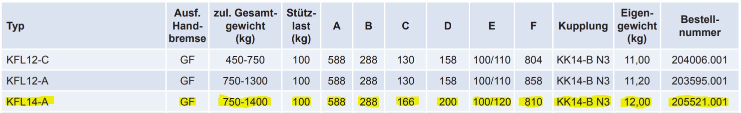 KNOTT Auflaufeinrichtung KFL14-A, 750-1400 kg,  Lochabstand vorne/hinten/seitlich 100-120/200/ 166 mm, Stützlast 100 kg, mit Zugkugelkupplung  KK14-B