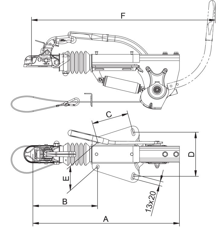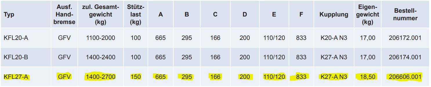 KNOTT Auflaufeinrichtung KFL27-A, 1400-2700 kg,  Lochabstand vorne/hinten/seitlich 110-120/200/ 166 mm, Stützlast 150 kg, mit Zugkugelkupplung  K27-A