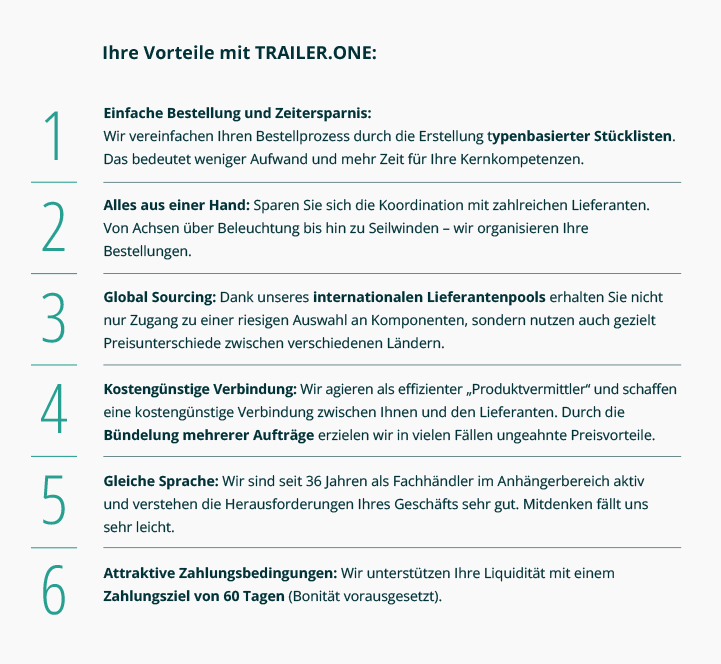 Als spezialisierter Anhängerhersteller wissen Sie, wie komplex und zeitaufwendig die Beschaffung von Komponenten sein kann. Mit dem Fahrzeugbau-Service von TRAILER.ONE vereinfachen wir Ihren Einkauf und liefern Ihnen alles, was Sie für die Produktion benötigen, aus einer Hand.