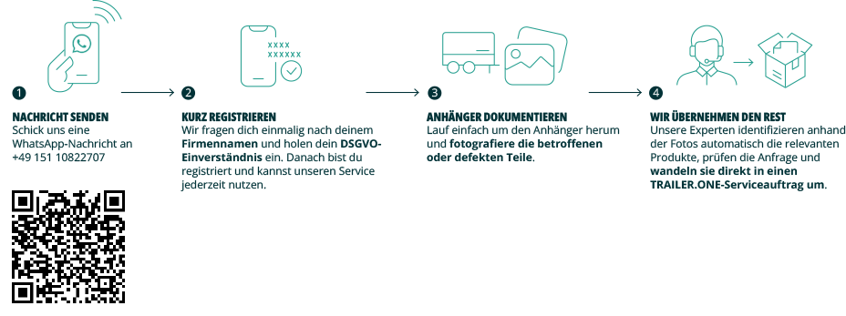 Ab sofort wird der Serviceprozess bei TRAILER.ONE noch einfacher. Mit dem neuen WhatsApp-Service kannst du deine Serviceanfragen direkt per Chat an uns übermitteln – schnell, unkompliziert und ohne zusätzliche Systeme. Einfach eine Nachricht an +49 151 10822707 senden – und schon geht's los!