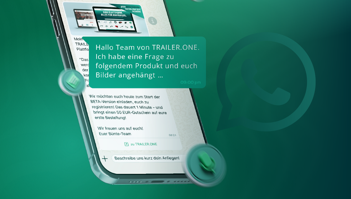 Speichere einfach +49 151 108 22 707 unter "TRAILER.ONE Service" in deinen Kontakten und sende uns deine erste Nachricht.