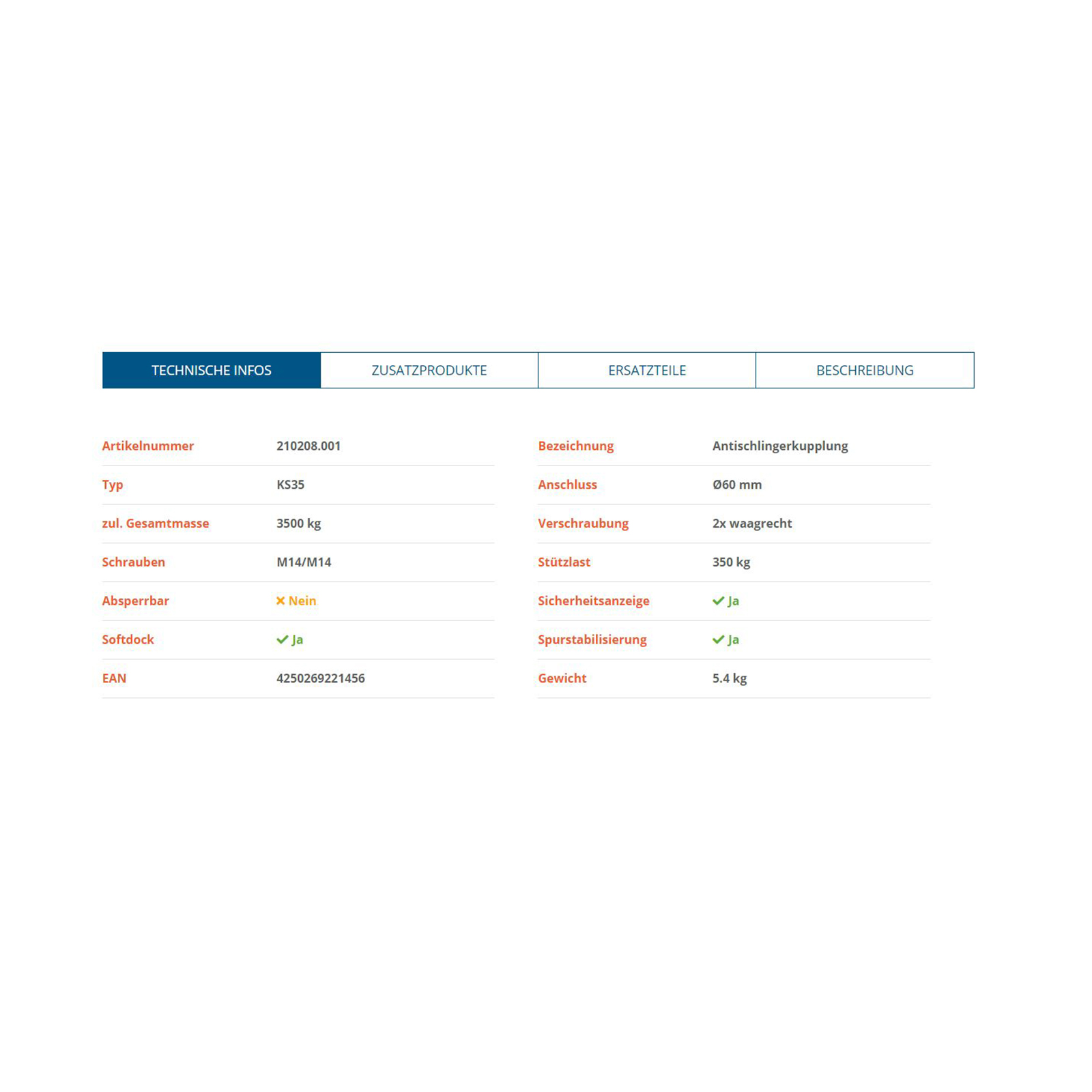 KNOTT Antischlingerkupplung KS35, bis 3500 kg,  ⌀ 60 mm, Lochabstand horizontal 54 mm, Bohrungen ⌀ 14,5 mm, Stützlast 350 kg, mit Safety-Ball,  Schutzkappe, Zubehör, Guss verzinkt
