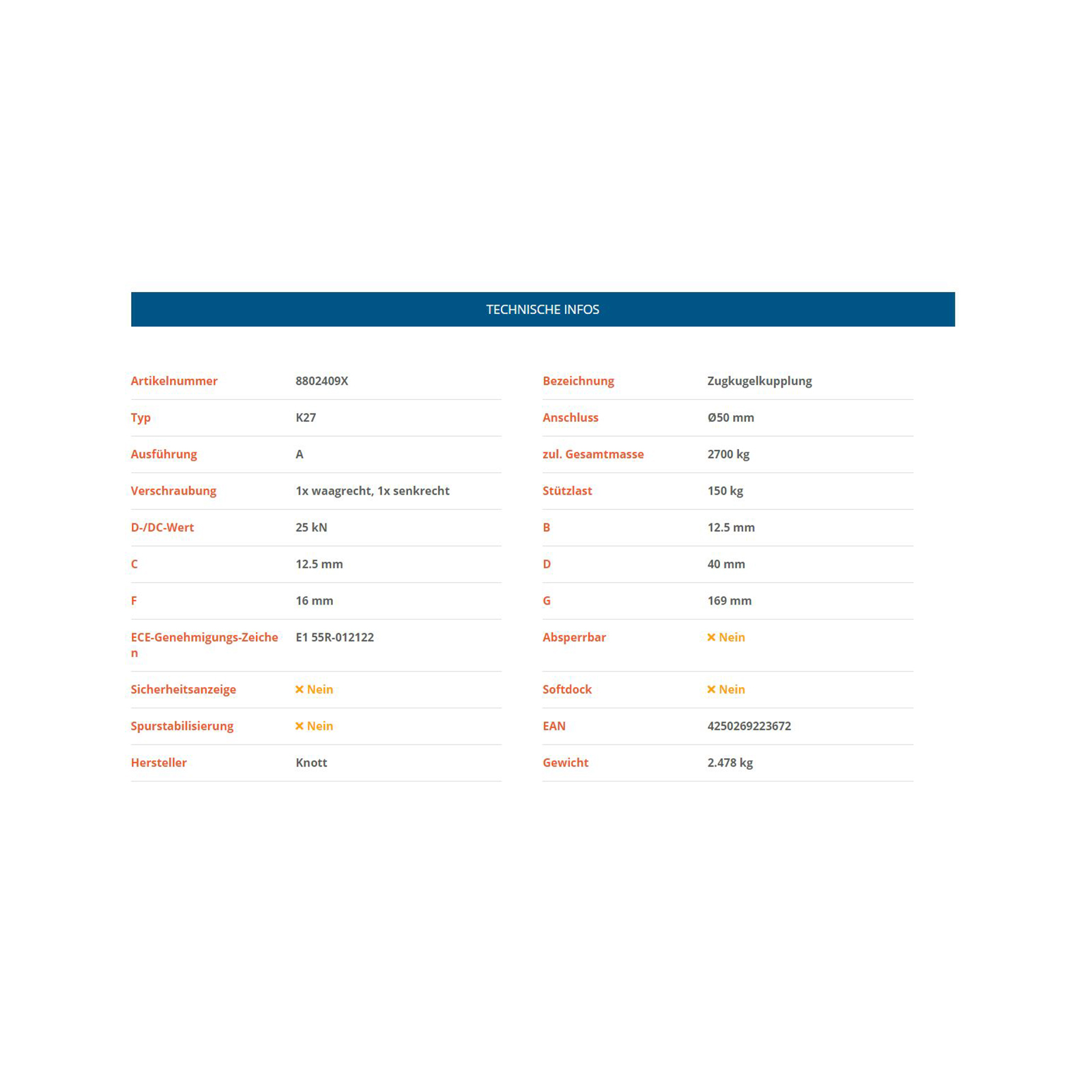 KNOTT Zugkugelkupplung K27-A, bis 2700 kg,  ⌀ 50 mm, Lochabstand kreuz 40 mm, Bohrungen ⌀ 12,5 mm, Stützlast 150 kg, Guss verzinkt