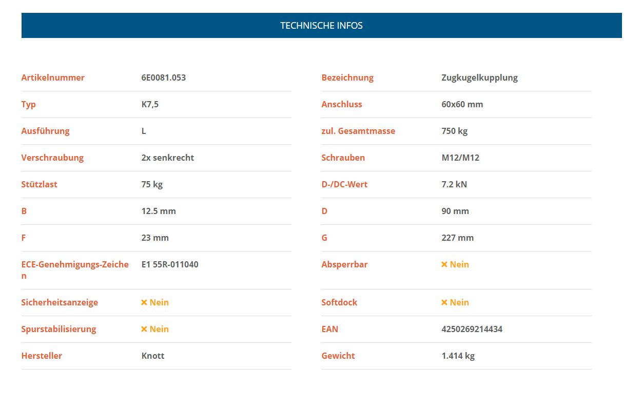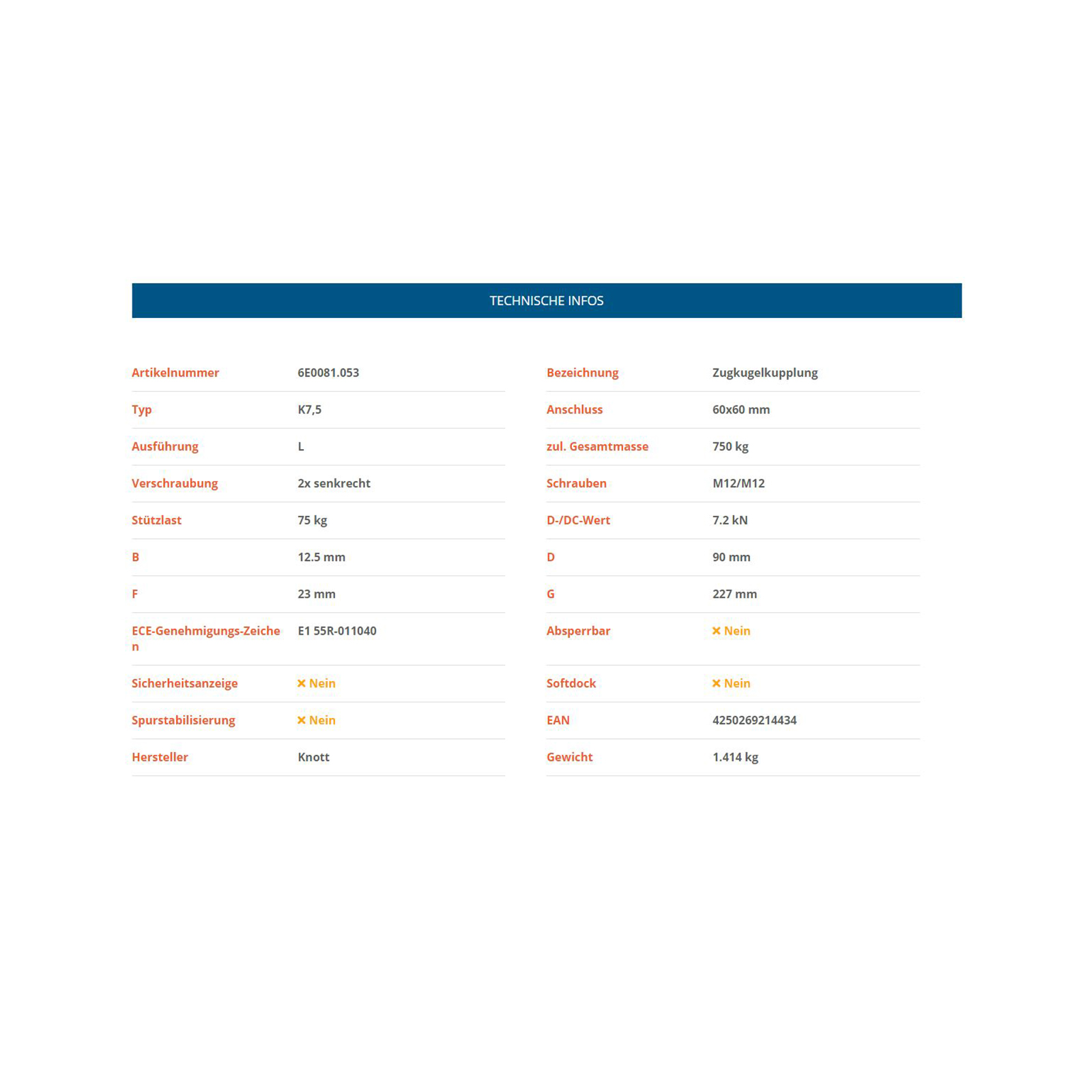 KNOTT Zugkugelkupplung K7,5-L, bis 750 kg,  Vkt. 60 mm, Lochabstand vertikal 90 mm, Bohrungen  ⌀ 12,5 mm, Stützlast 75 kg, Stahl verzinkt