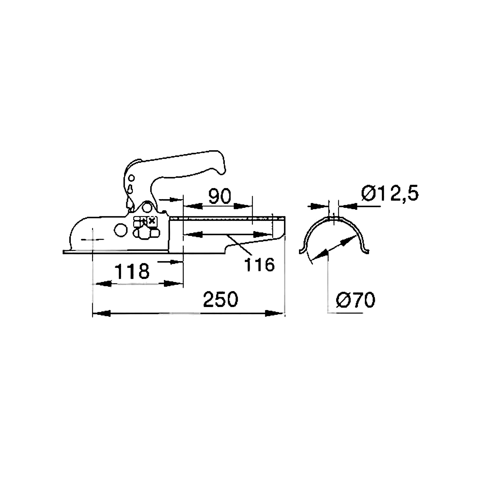 AL-BE Zugkugelkupplung EM 150 R-G, bis 1500 kg,  ⌀ 70 mm, Lochabstand vertikal 90/116 mm,  Bohrungen ⌀ 12,5 mm, Stützlast 100 kg, Stahl verzinkt