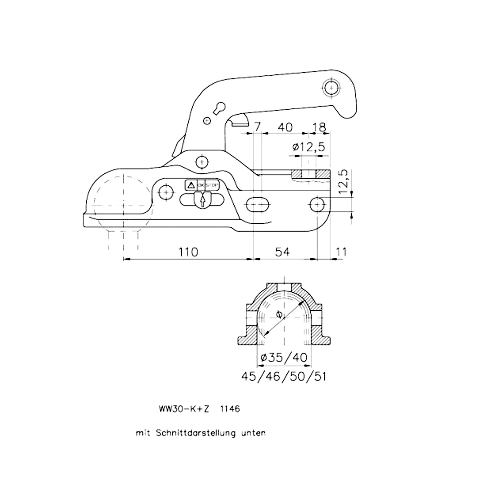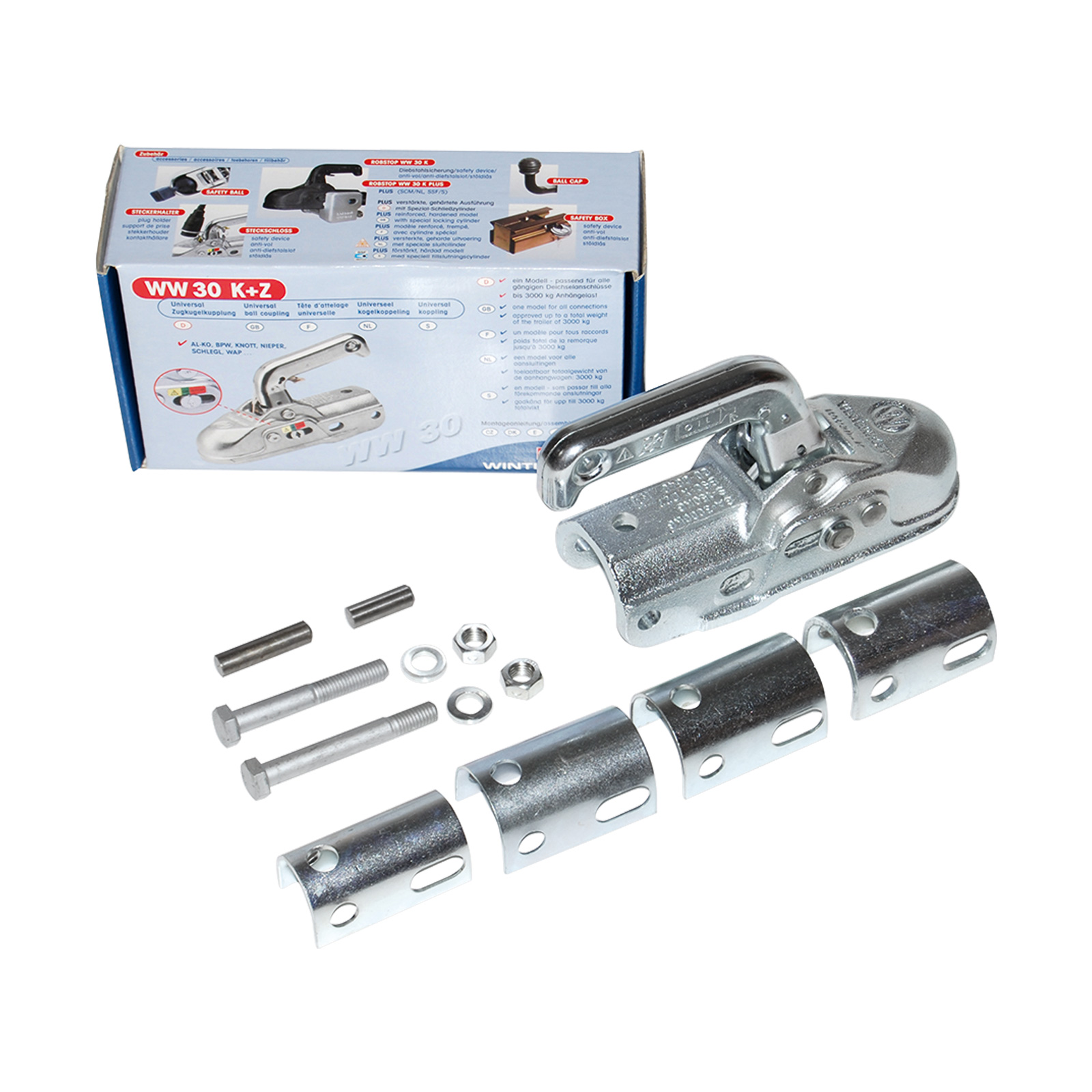 WINTERHOFF Zugkugelkupplung WW 30-K+Z, universal, bis 3000 kg, ⌀ 35/40/45/46/50/51 mm, Lochabstand kreuz/horizontal 40/54 mm, Bohrungen ⌀ 12,5 mm, Stützlast 150 kg, mit Zubehör, Temperguss