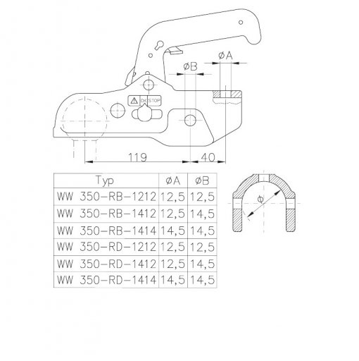 WINTERHOFF Zugkugelkupplung WW 350-RB-1414, bis   3500 kg, ⌀ 50 mm, Lochabstand kreuz 40 mm, Bohrungen ⌀ 14,5/12,5 mm, Stützlast 200 kg,  Temperguss