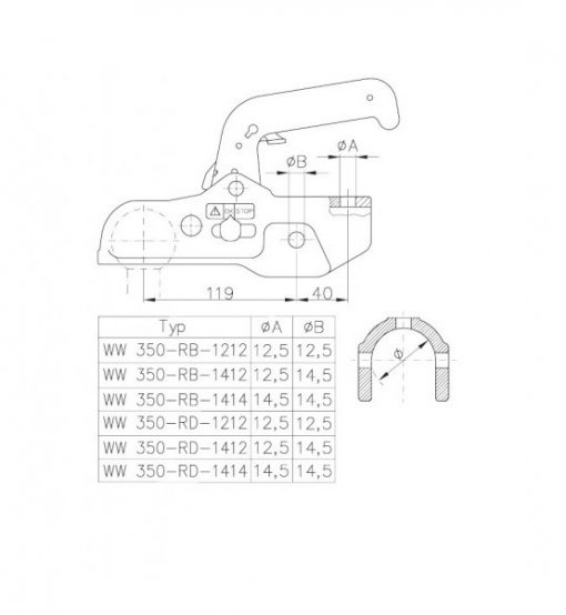 WINTERHOFF Zugkugelkupplung WW 350-RB-1414, bis   3500 kg, ⌀ 50 mm, Lochabstand kreuz 40 mm, Bohrungen ⌀ 14,5 mm, Stützlast 200 kg, Temperguss