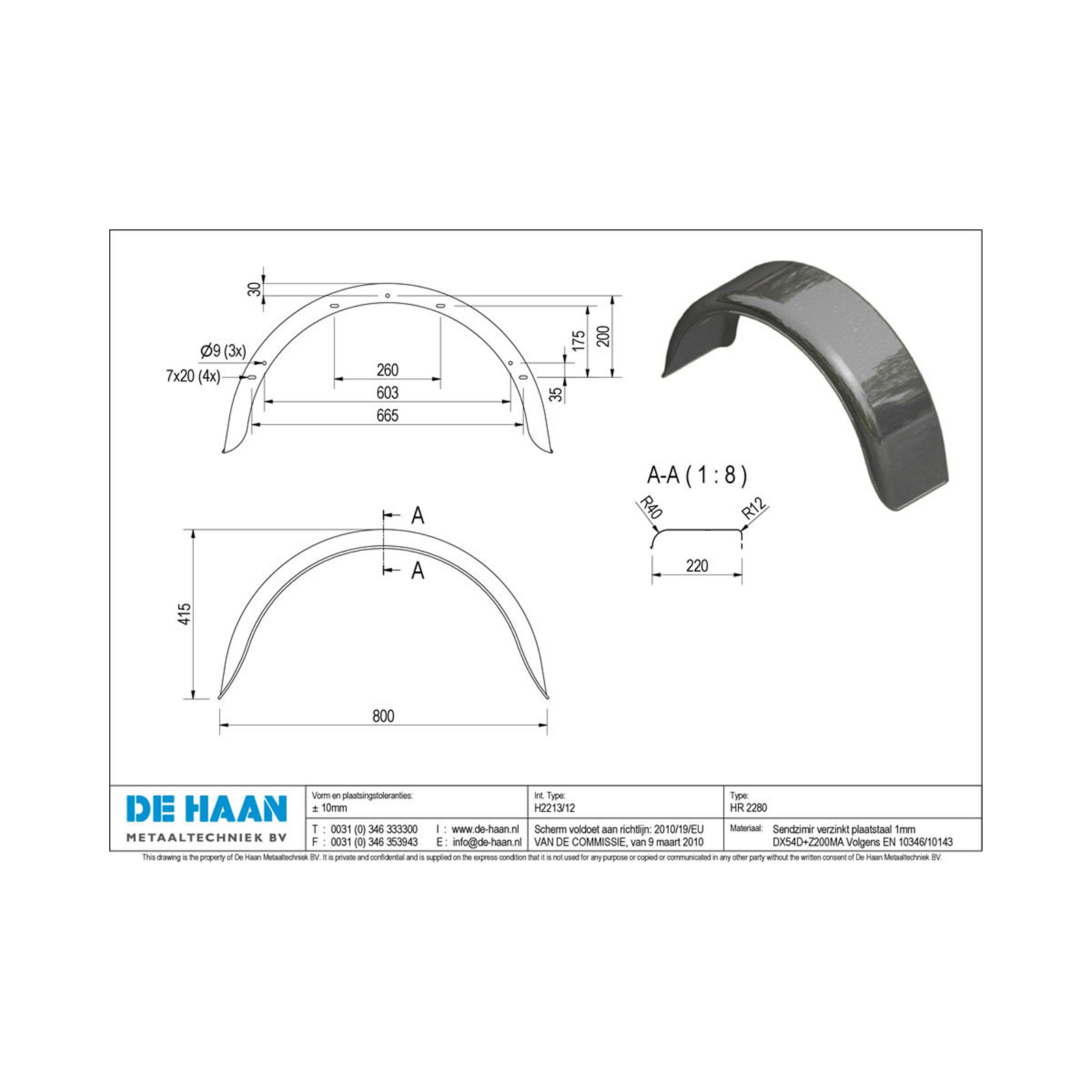 DE HAAN HR 2280 Einachskotflügel, H 2213/12 Breite 220 mm, Spannweite 800 mm, rund