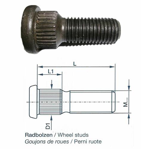 Radbolzen mit Riffelbund, M12 x 1,5 x 36 mm, Riffelung ⌀ 17 x 8,5 mm