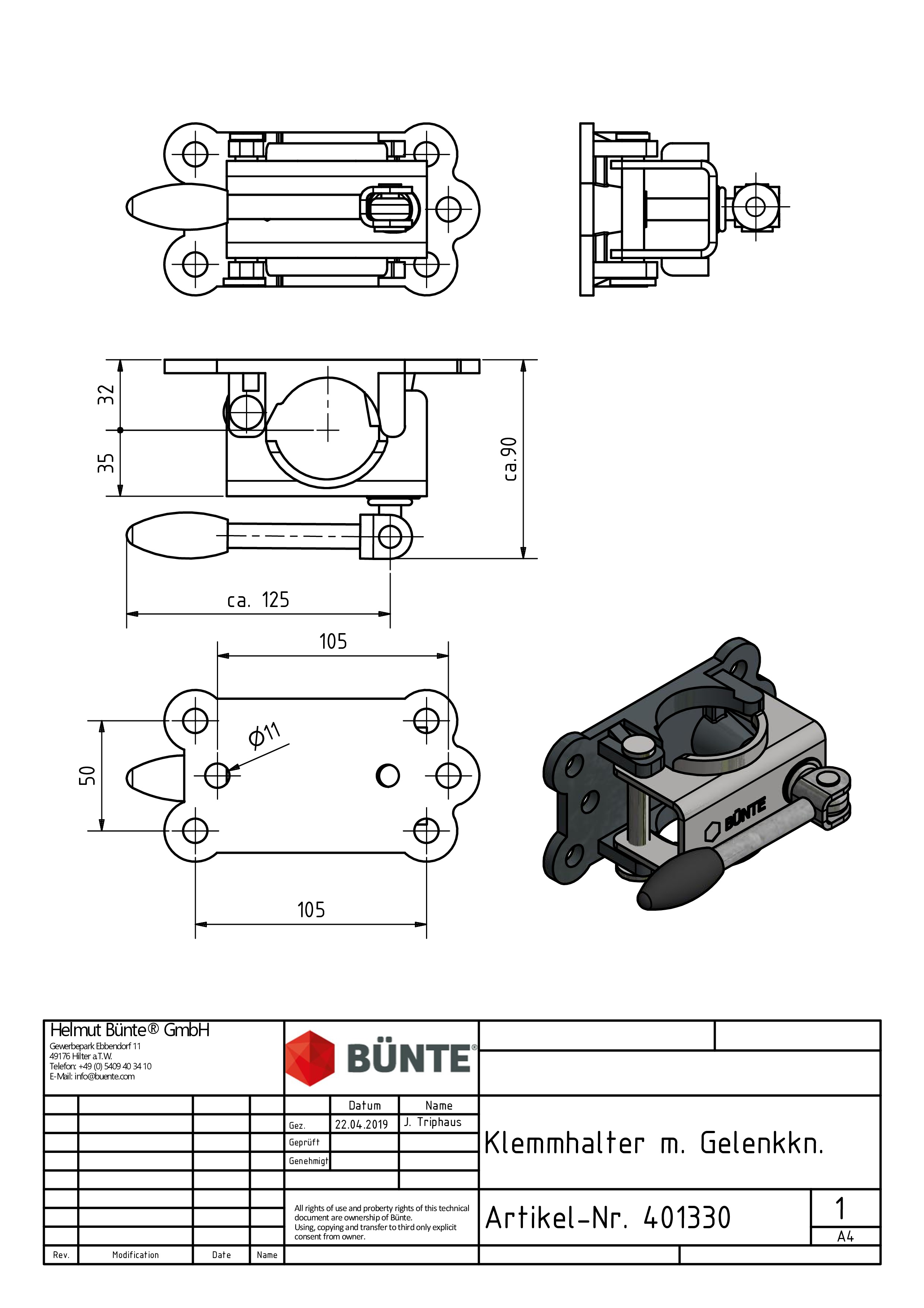 BÜNTE Klemmhalter, für Stützrad/Stütze ⌀ 48 mm, 6-Loch, mit Gelenkknebelschraube M12, Lochabstand 50/105 mm, Bohrungen ⌀ 11 mm, Temperguss