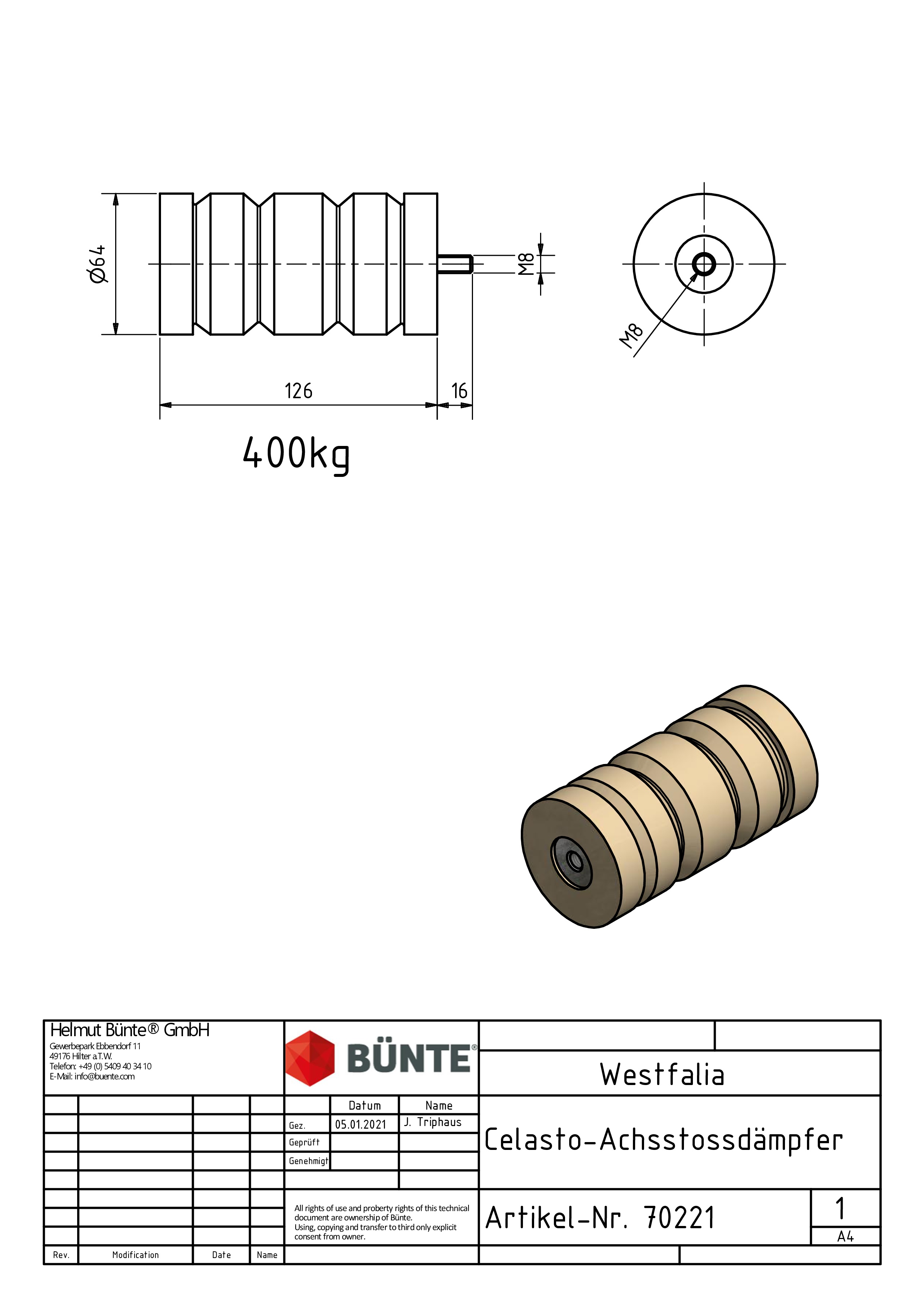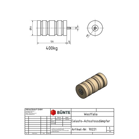 Die Cellastofeder Ø 64 x 126 mm mit 400 kg Tragkraft ist die ideale Lösung für eine zuverlässige Federung und effektive Stoßdämpfung bei Westfalia Anhängern. Als hochwertiges Federelement sorgt sie für mehr Fahrkomfort, reduziert Vibrationen und schützt zuverlässig Fahrwerk sowie Ladung – selbst bei anspruchsvollen Transportbedingungen.