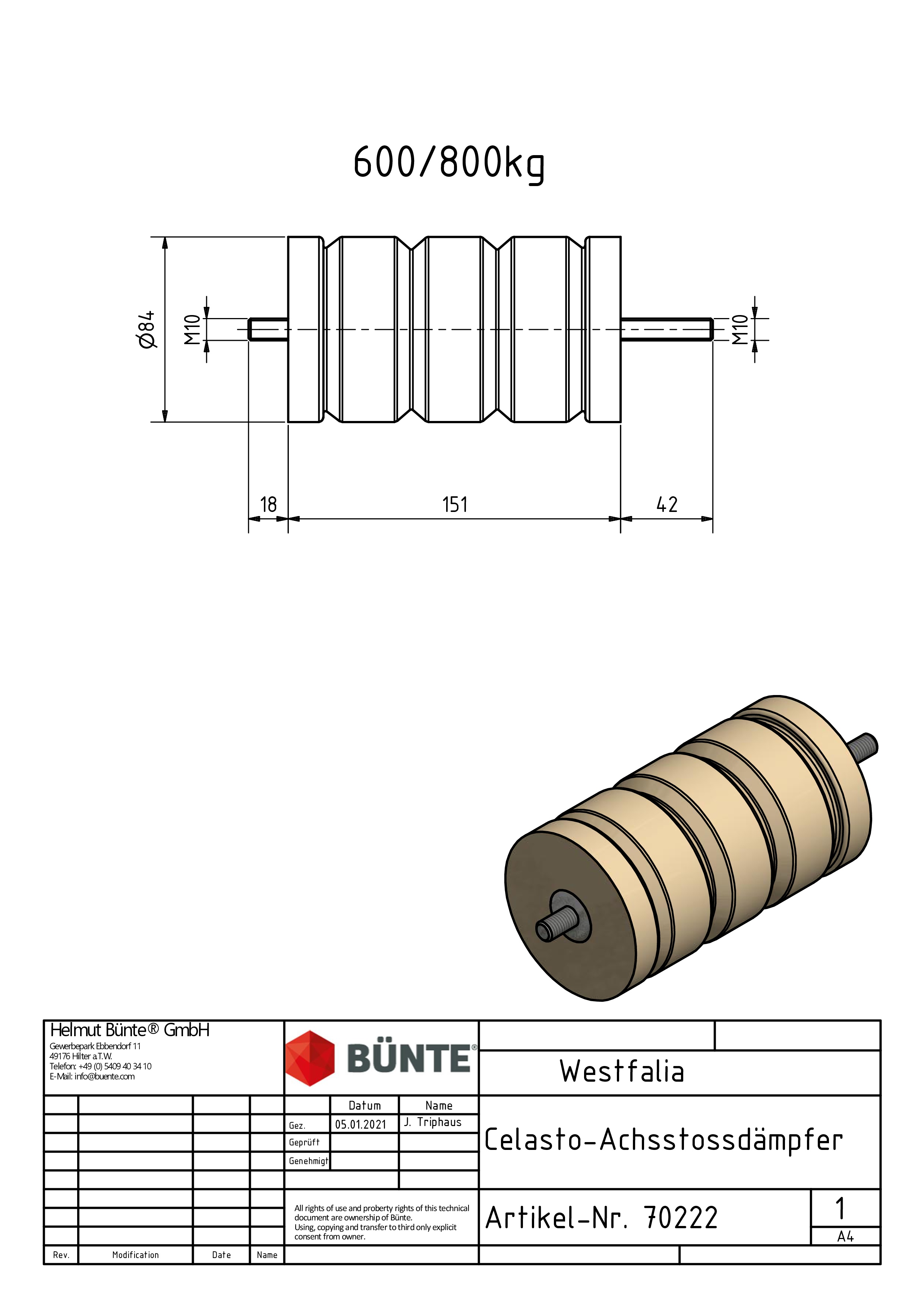 Cellastofeder, ⌀ 84 x 151 mm, 800 kg, für WESTFALIA, mit Gewindestifte M10