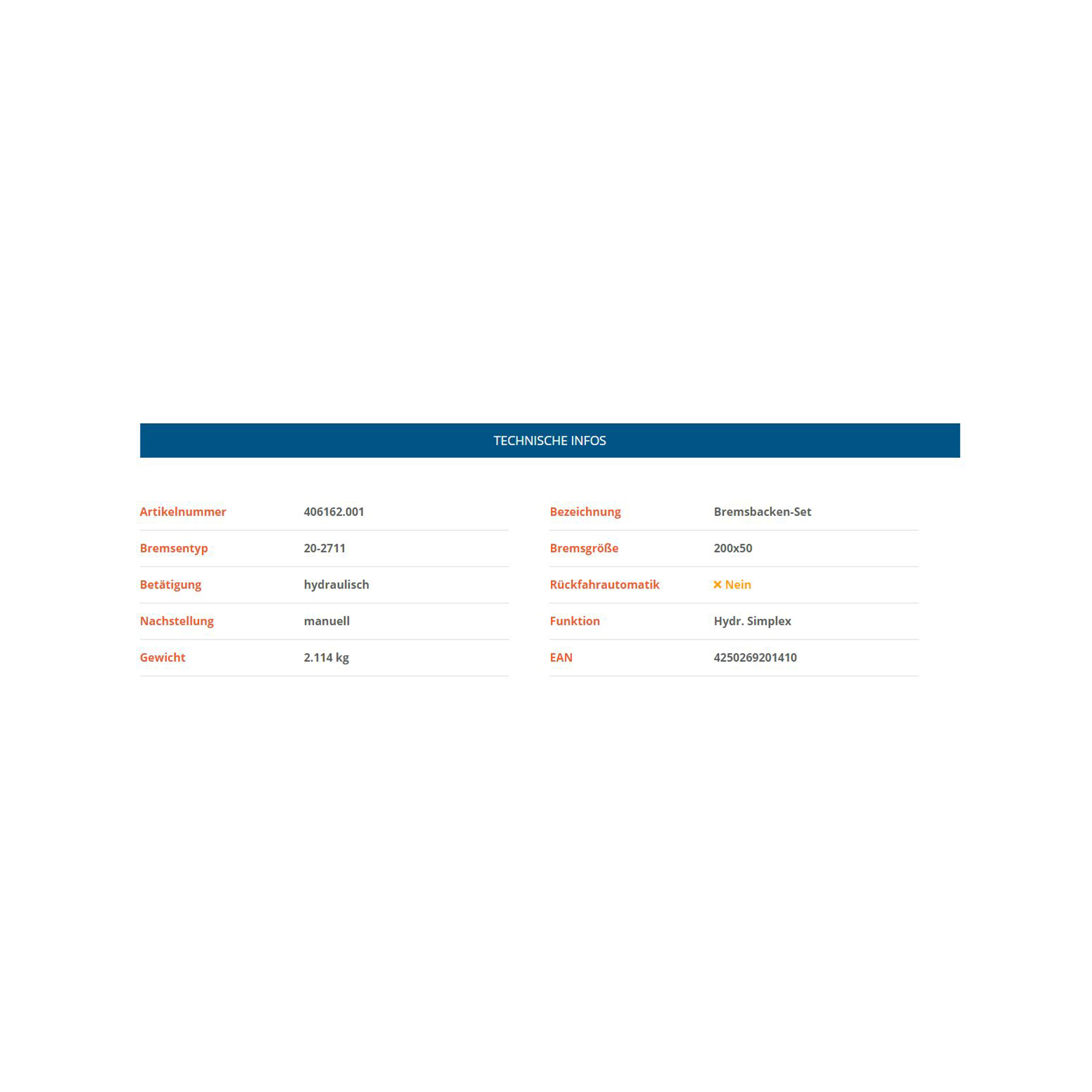 KNOTT Bremsbackensatz, 200 x 50 mm, f. RB 20-2711 hydraulisch