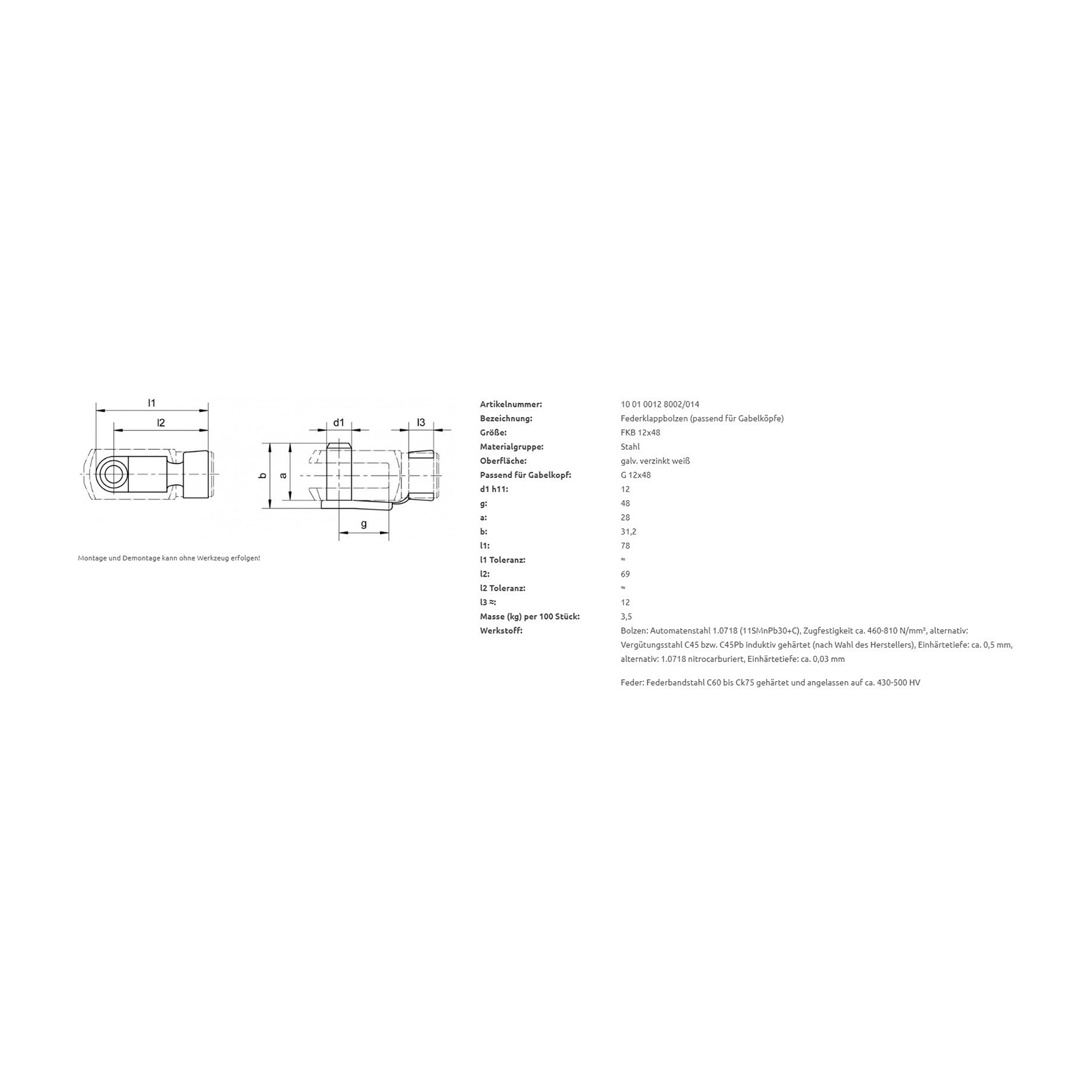 Federklappbolzen Ø 12 mm, 31,2 x 78 mm wirksame Länge 69 mm, f. Gabelkopf 40202