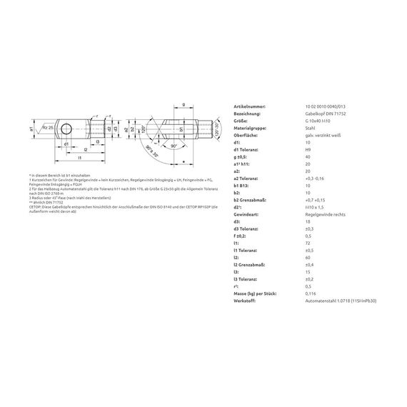 Gabelkopf M10, 20 x 72 mm, Bohrung Ø 10 mm wirksame Länge 60 mm