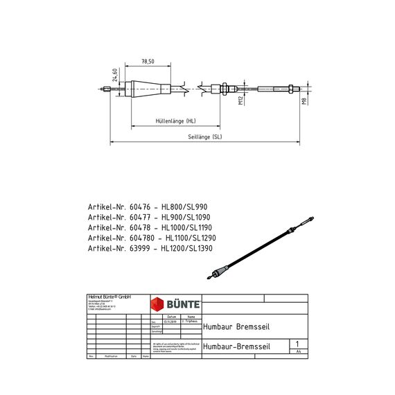 WAP Bremsseil, HL 800/SL 990 mm Gewinde Seil M8, Glocke Ø 24,6 mm, f. HUMBAUR