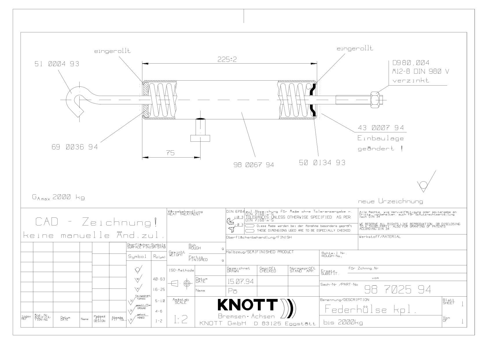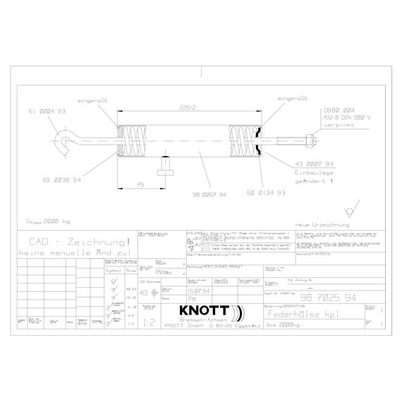 Die Knott Federhülse Ø 48 mm, 225 mm für Handbremshebel Ausführung KH ist ein unverzichtbares Ersatzteil für die zuverlässige Funktion Ihrer Anhänger-Bremsanlage. Entwickelt für Auflaufeinrichtungen bis 2000 kg, sorgt dieser hochwertige Federspeicher für eine gleichmäßige Kraftübertragung und eine sichere Feststellbremse – selbst bei hoher Belastung. Dank robuster Bauweise und präziser Passform ist sie die ideale Wahl für Reparatur, Wartung oder Austausch.