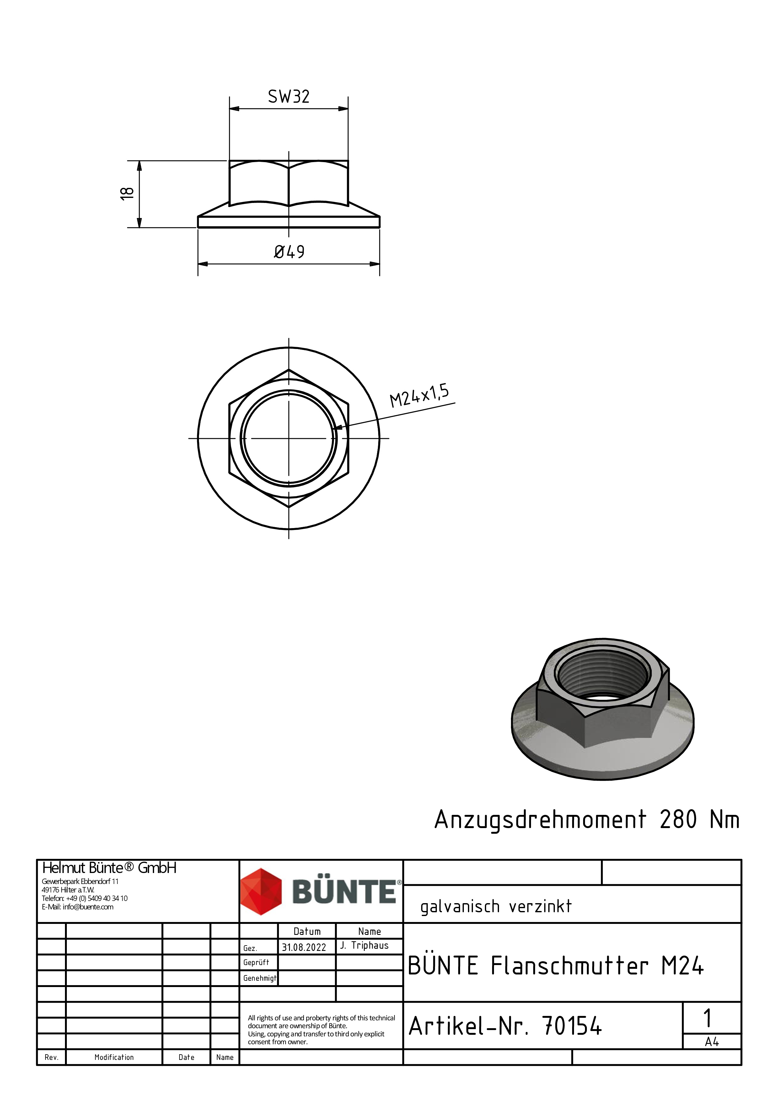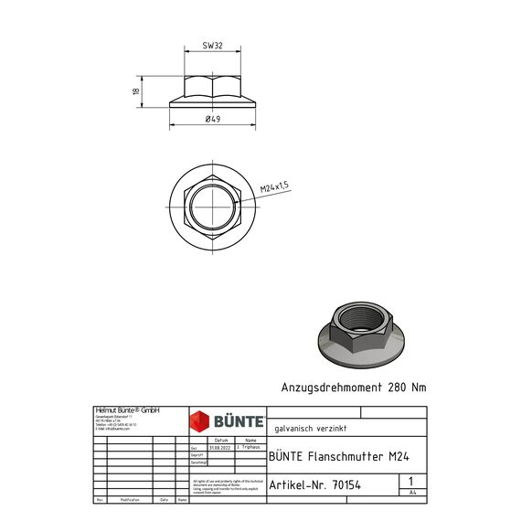 KNOTT Flanschmutter, M24 x 1,5 mm, Ø 49 x 18 mm Schlüsselweite 32, Anzugsdrehmoment 280 Nm