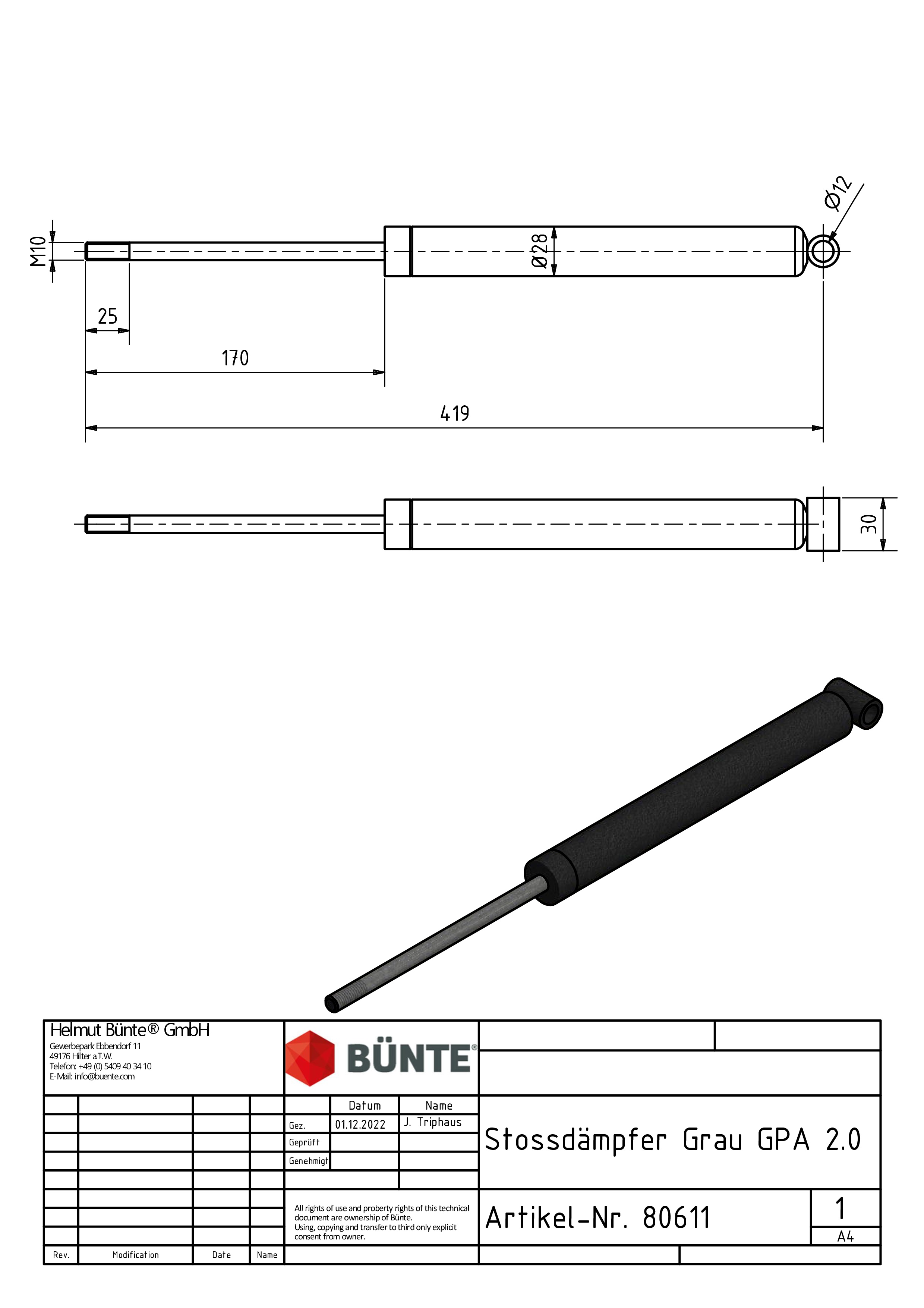 Auflaufstoßdämpfer, f. GRAU GPA 2,0, Ø 28 mm 420 mm, Bohrung Ø 12 mm/Gewinde M10