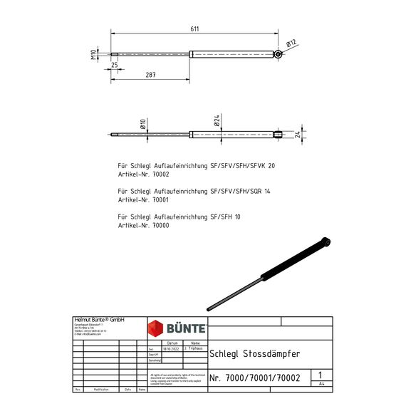 SCHLEGL Auflaufstoßdämpfer, f. SF/SFV/SFVK/SFH20 Ø 24 mm, 611 mm, Bohrung Ø 12 mm/Gewinde M10