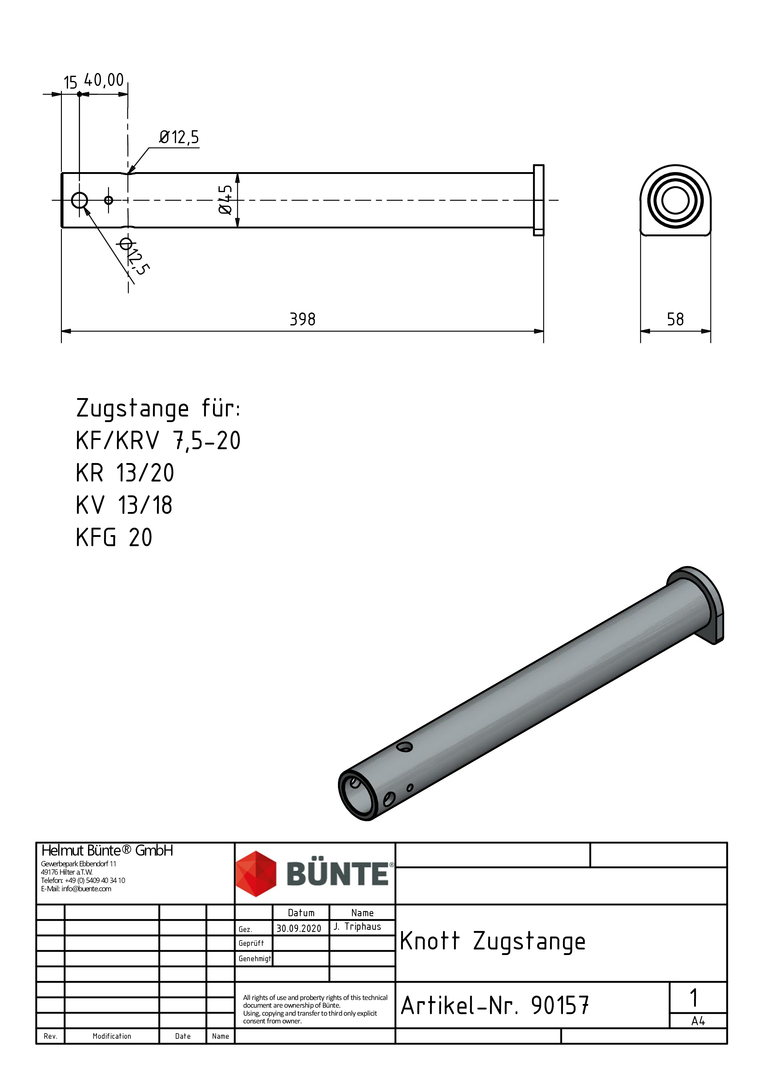KNOTT Zugstange, f. KF/KR17-20, KFG20, KV13-20/HV Ø 45 x 399 mm, m. Ring, LA kreuz 40 mm, Ø 12,5 mm