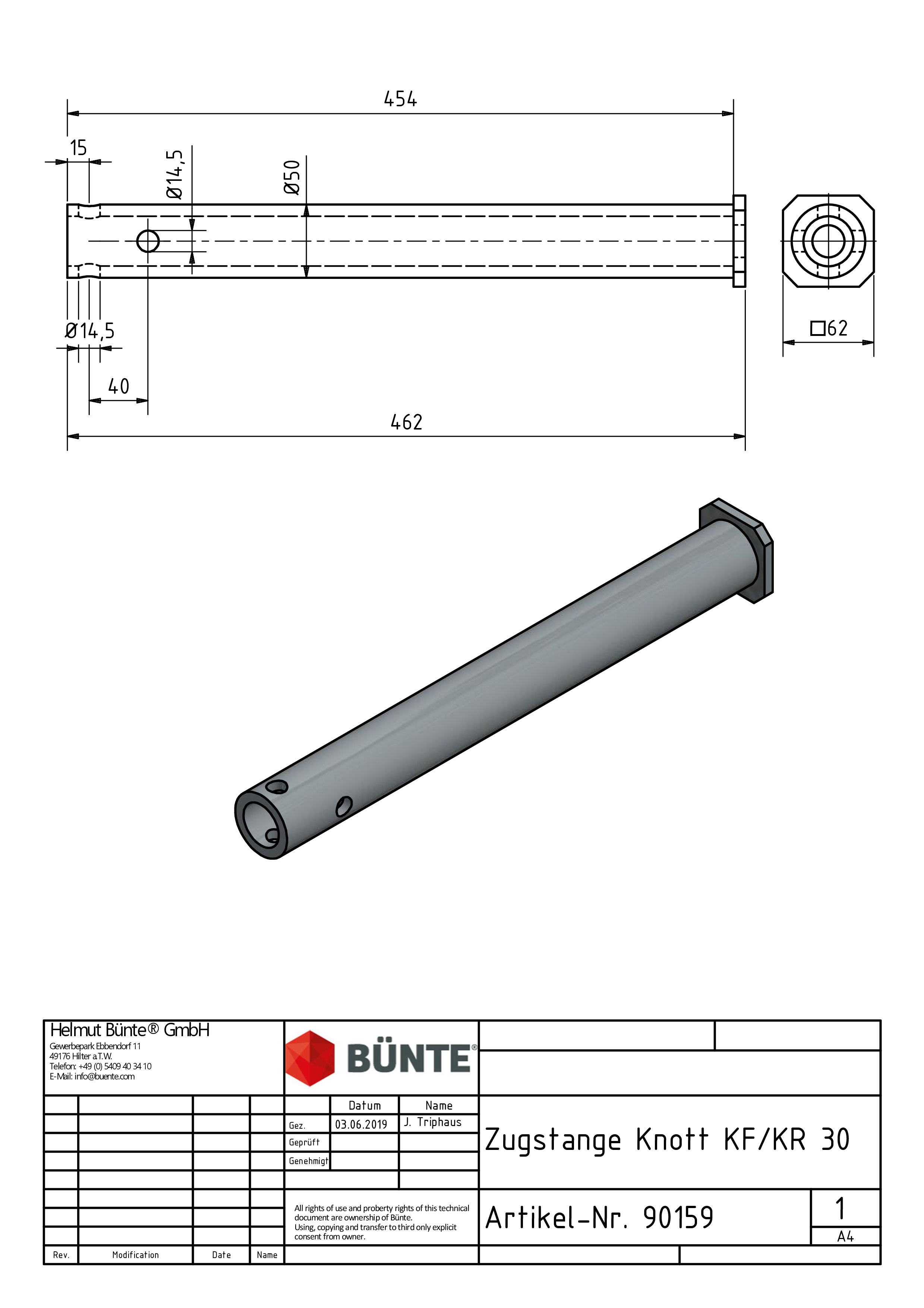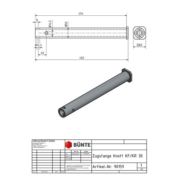 KNOTT Zugstange, f. KF30-C/KR30, Ø 50 x 461 mm m. Ring, LA kreuz 40 mm, Bohrungen Ø 14,5 mm