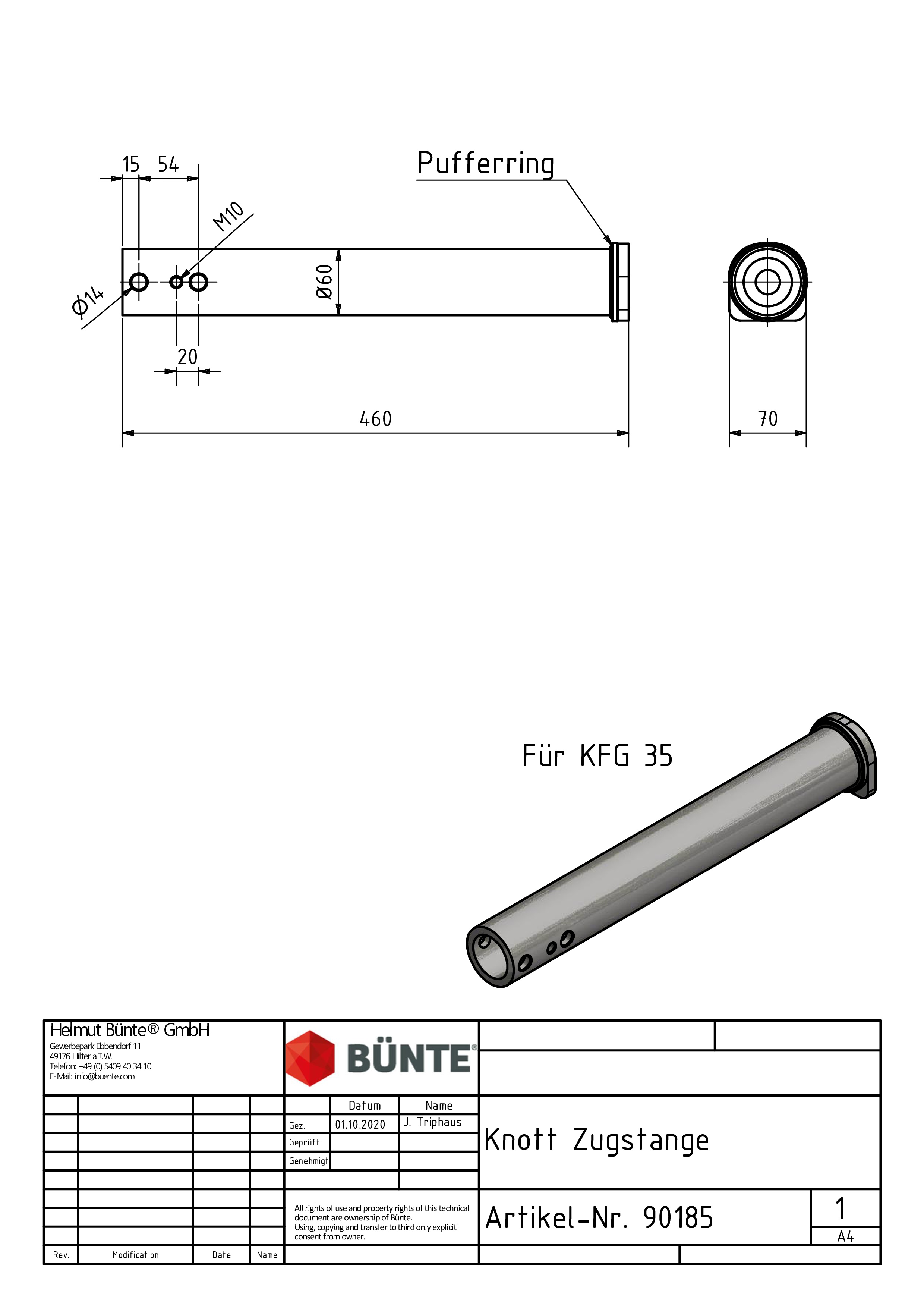 KNOTT Zugstange, f. KFG/KR35, Ø 60 x 460 mm m. Ring, LA horizontal 54 mm, Bohrungen Ø 14,5 mm