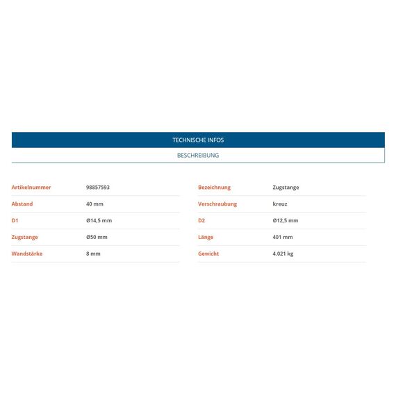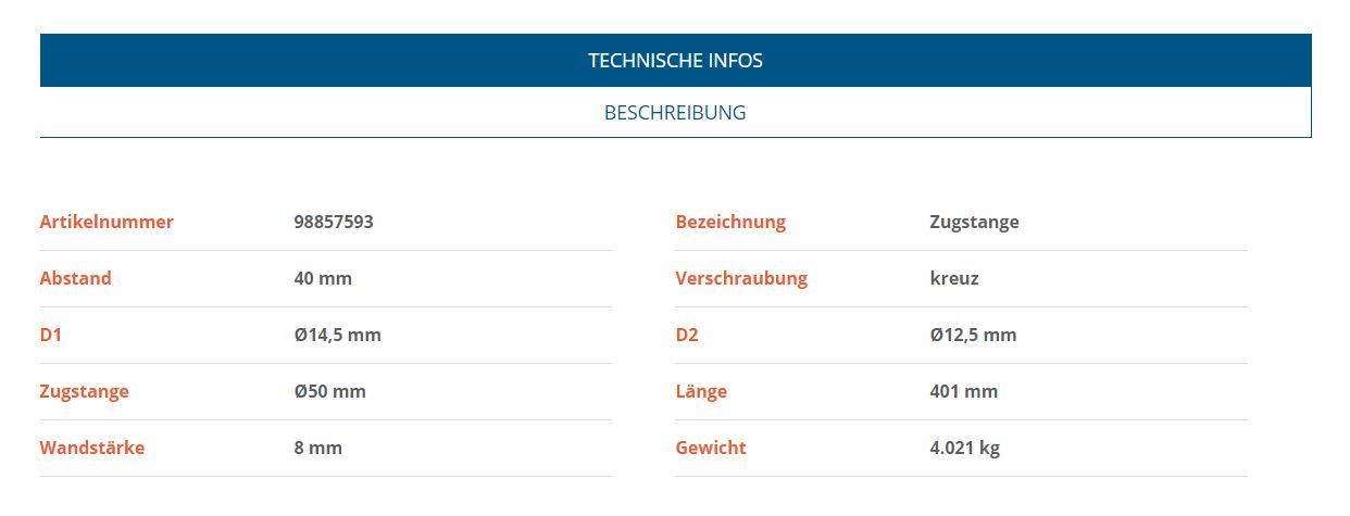 Diese Zugstange wurde speziell für Knott Auflaufeinrichtungen der Baureihe KFG30 entwickelt und erfüllt höchste Anforderungen im Anhängerbereich. Mit einem Außendurchmesser von 50 mm und einer Länge von ca. 401 mm passt sie exakt in bestehende Systeme und gewährleistet eine sichere Funktion der Bremsmechanik.