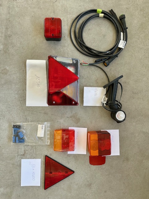 SONDERPOSTEN – Konvolut Anhängerbeleuchtung & Lichttechnik, bestehend aus verschiedenen Rückleuchten, Blink-/Brems-/Positionslicht-Einsätzen, Dreieck-Rückstrahlern, Kabelsätzen (Art. 10559), LED-Positionslichtern, Leuchtenabdeckungen sowie diversem Montagezubehör (DC-Verbinder).
