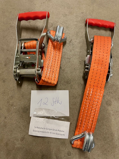 SONDERPOSTEN – 12 × Ratschen für Zurrgurt, geeignet für 50-mm Spanngurte. Robuste Ratschenmechanik mit Haken, belastbares orangefarbenes Gurtband und ergonomischem Griff für sichere Ladungssicherung. Ideal für Anhänger, Transportfahrzeuge und Werkstattbedarf.