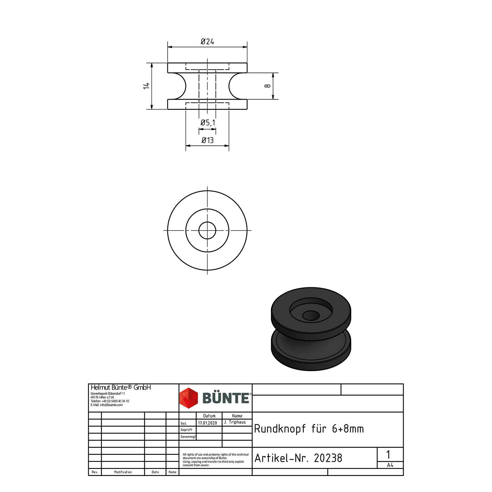 Rundknopf, ⌀ 24 x 14 mm, beidseitig montierbar, Nietloch ⌀ 5 mm, für Expanderseil ⌀ 6/8 mm,  schwarz, Kunststoff